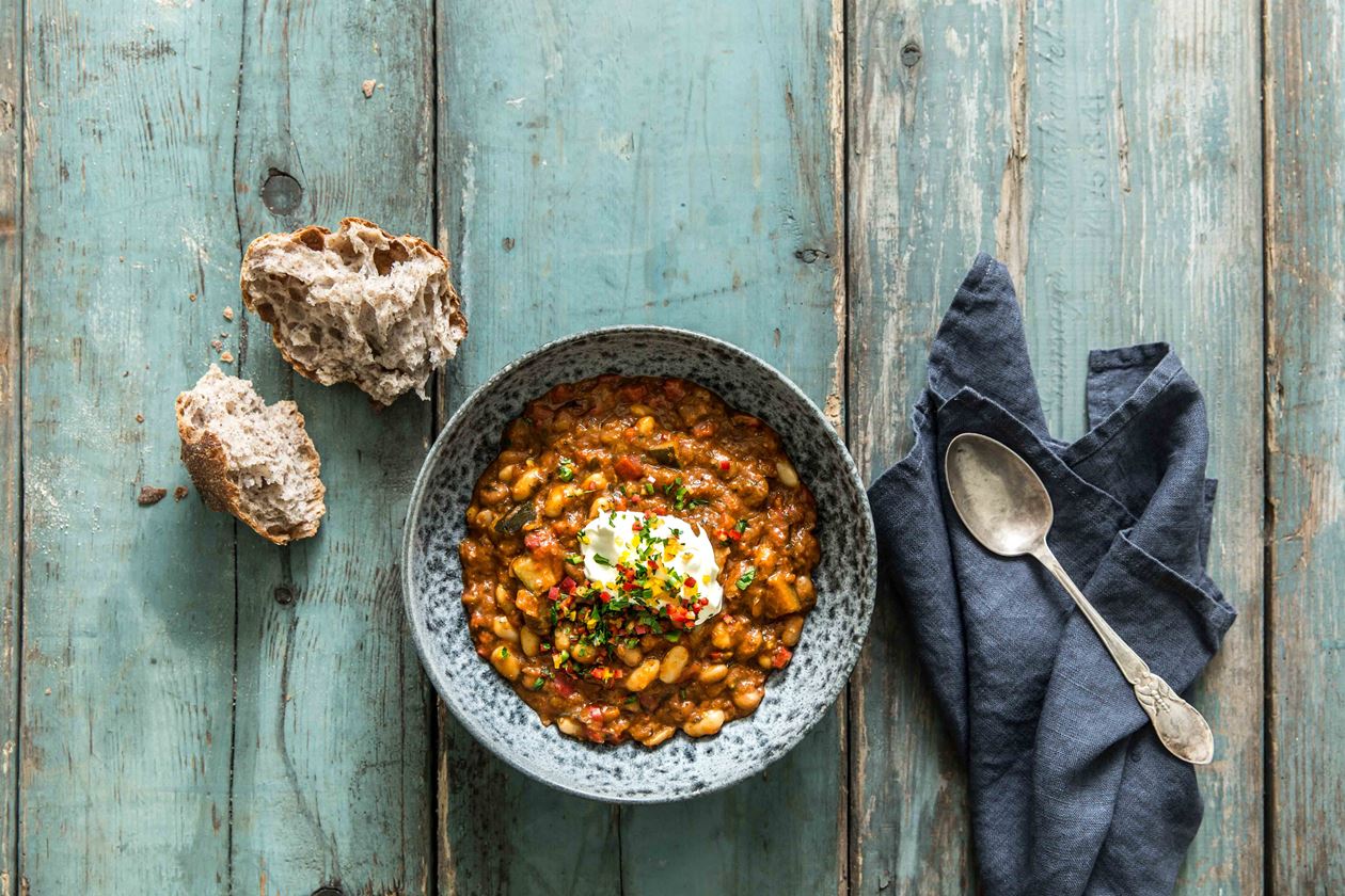 Kom til slut grofthakket spinat, hvide og brune bønner ved og lad det integrere sig i retten. Juster med vand eller grøntsagsbouillon undervejs, så retten ikke koger tør. Smag til med salt og peber.