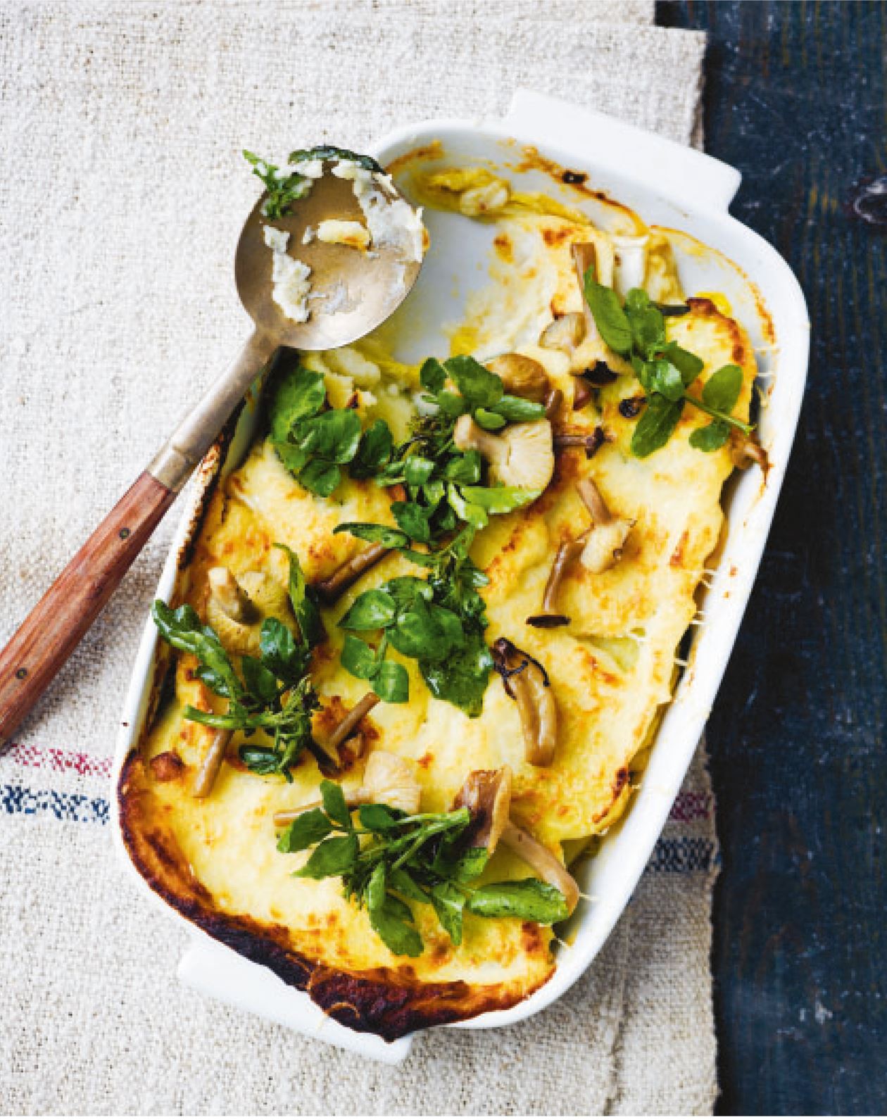 Smør et ildfast fad i passende størrelse. Læg først et lag kartofler i faget, dernæst sellerisovs, squash, kål og et lag af den sauterede spinat. Start forfra, og bliv ved til det hele er brugt. Riv resten af osten på toppen og bag fadet i 1,5 time ved 150 grader.