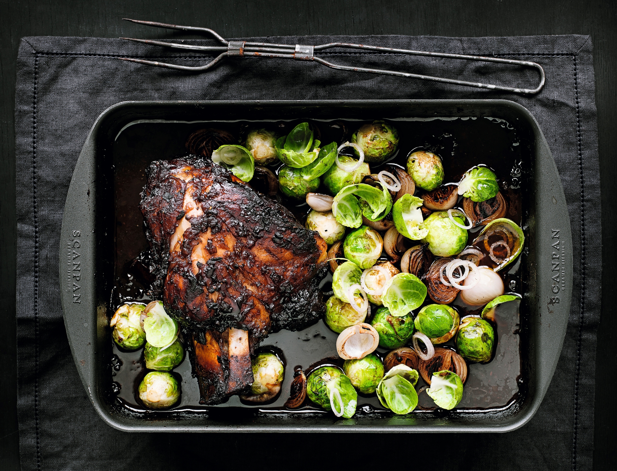 Tag alufolien af fadet i den sidste time, og skru op på 175°, så skankene bliver flotte og gyldne.
