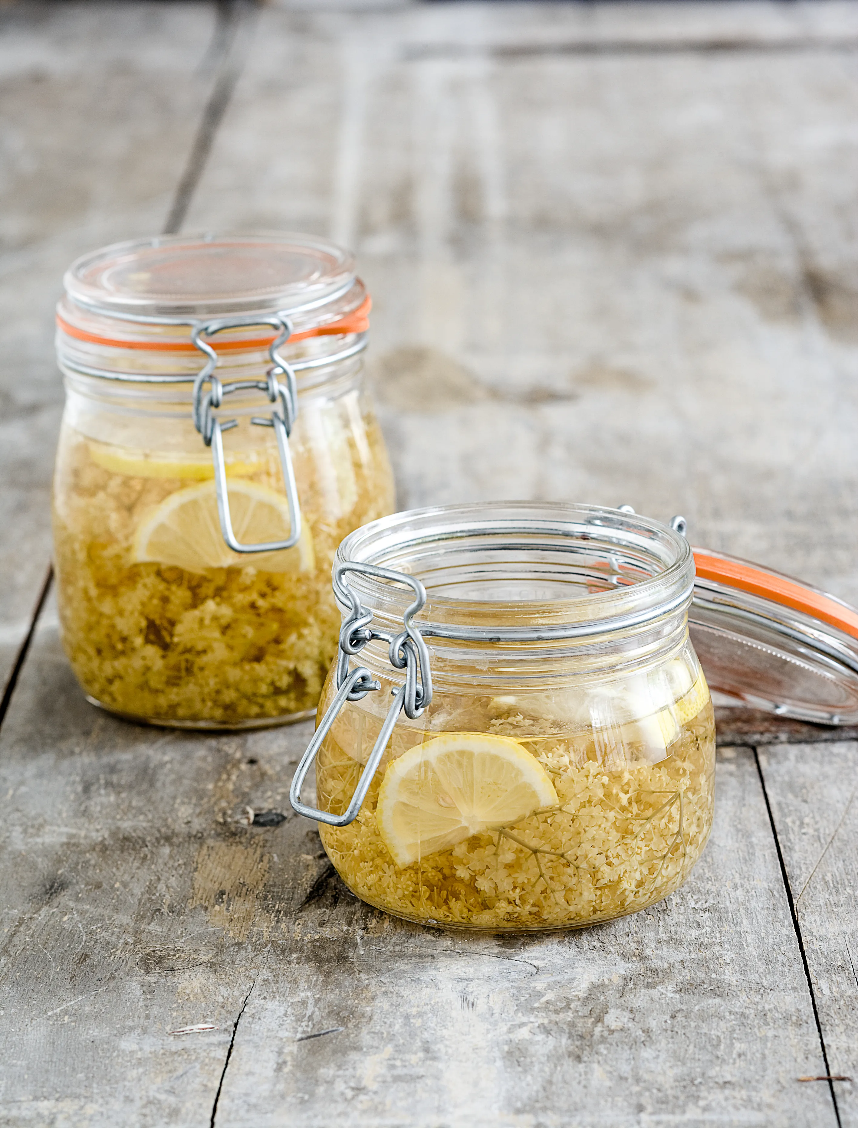 Klip blomsterne af stilkene og kom dem i en skål. Skær citronerne i skiver, og kom dem i en gryde sammen med sukker og vand. Varm vand og sukker op lige til kogepunktet, og hæld det over hyldeblomsterne. Lad saften trække i 12 timer på køkkebordet, inden du sigter den og hælder den på flasker. Opbevar saften i køleskab, hvor den kan holde sig i 30-40 dage.