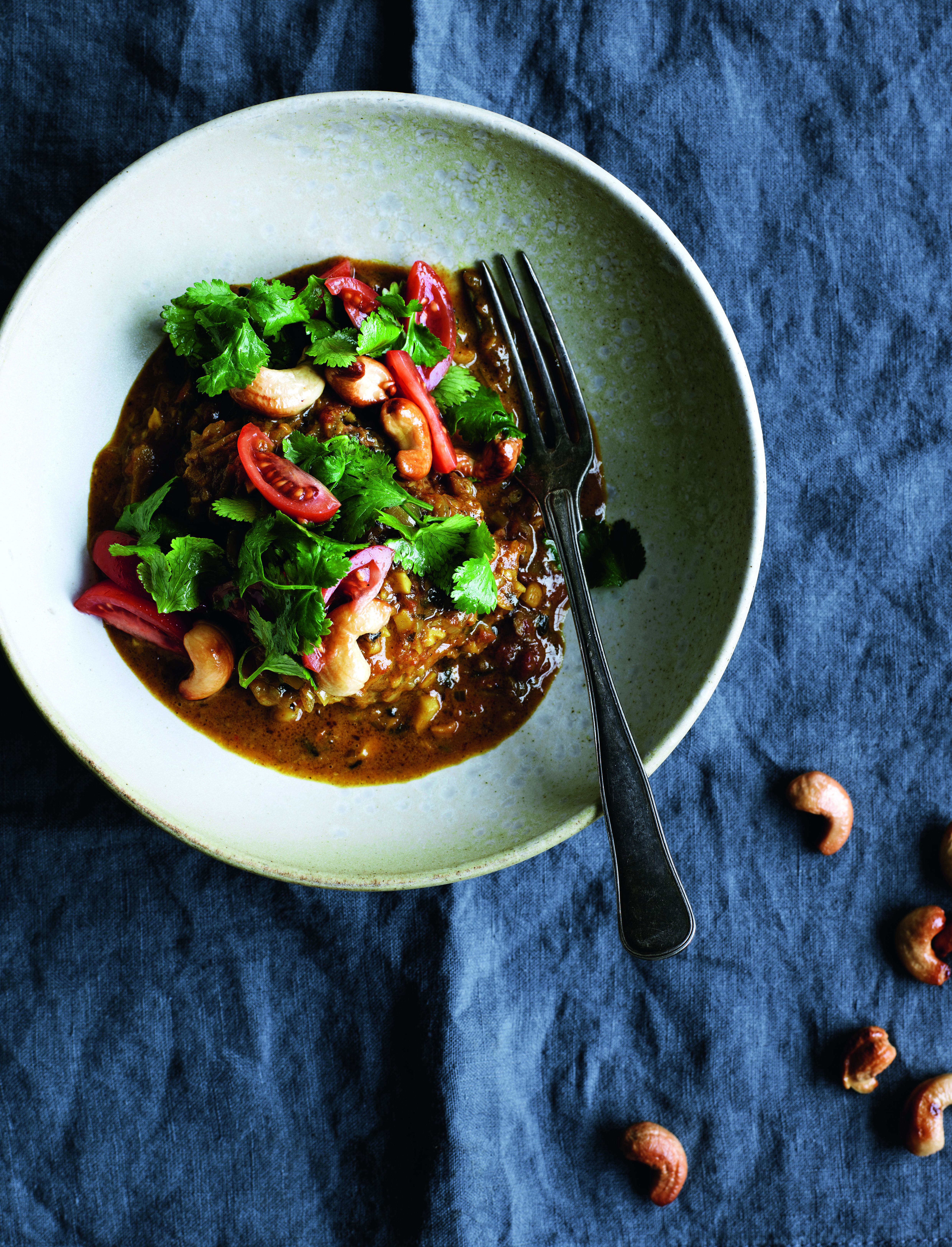 Kog sovsen igennem med cremefraiche eller fløde og cashewnødder. Smag til med salt og peber, og juster med citronsaft.