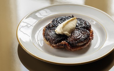 Anret julesalatbladene på et fad, og fordel løg og brødcroutoner over dem.