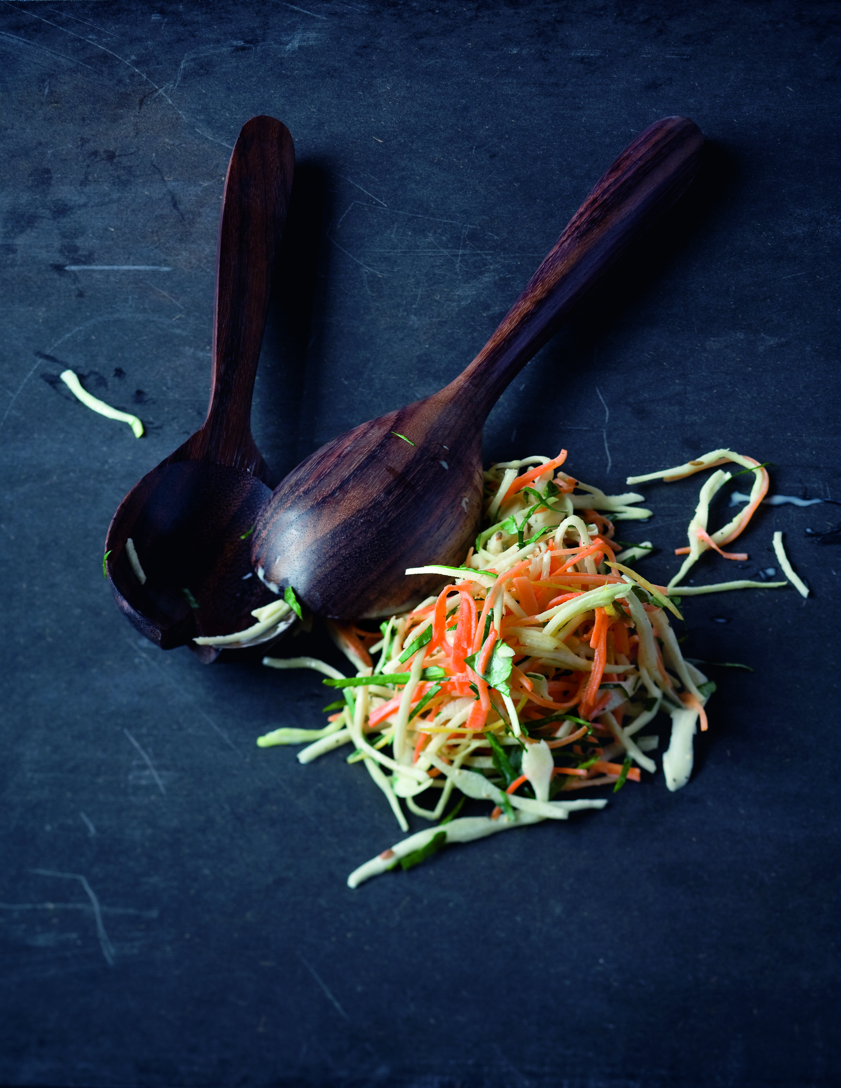Skær stokken fri af hvidkålen, kassér den, og snit kålen i tynde strimler på max 2 mm. Det er nemmest at bruge et mandolinjern eller råkostjernet på en foodprocessor, men tålmodighed og en skarp kniv kan også gøre det. Skræl gulerødderne, og skær dem i flotte tynde strimler ligeledes på mandolin- eller råkostjern. Skyl og pil bladene af persillen, og hak den groft, gerne i strimler.