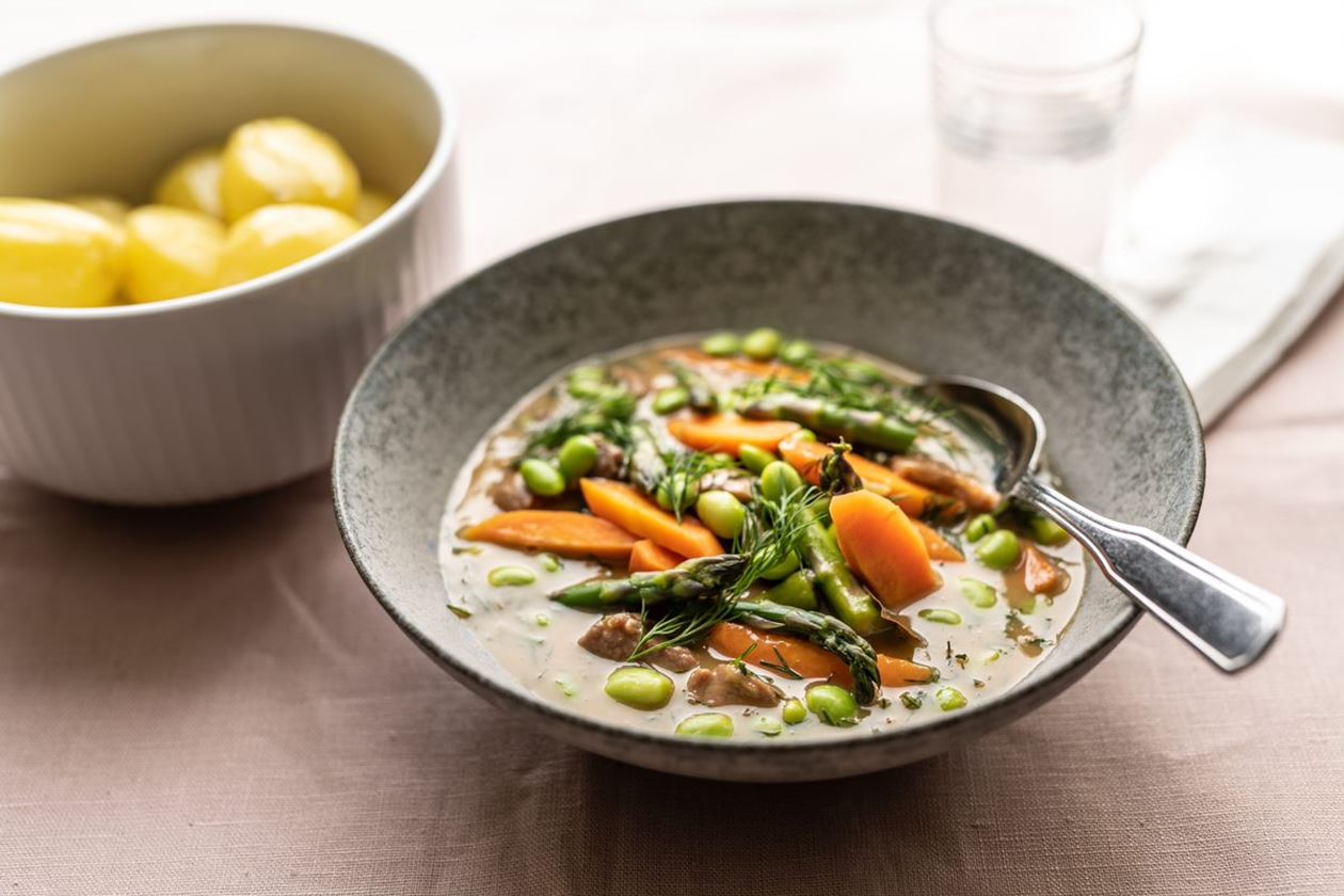 Skær eller bræk de nederste par cm af aspargesene. Skær hver asparges i grove snitter. Kom kalkunen tilbage i sovsen sammen med gulerødder, dild, asparges og edamamebønner. Lad det simre i 1-2 minutter. Smag til med salt, peber og lidt citronsaft.