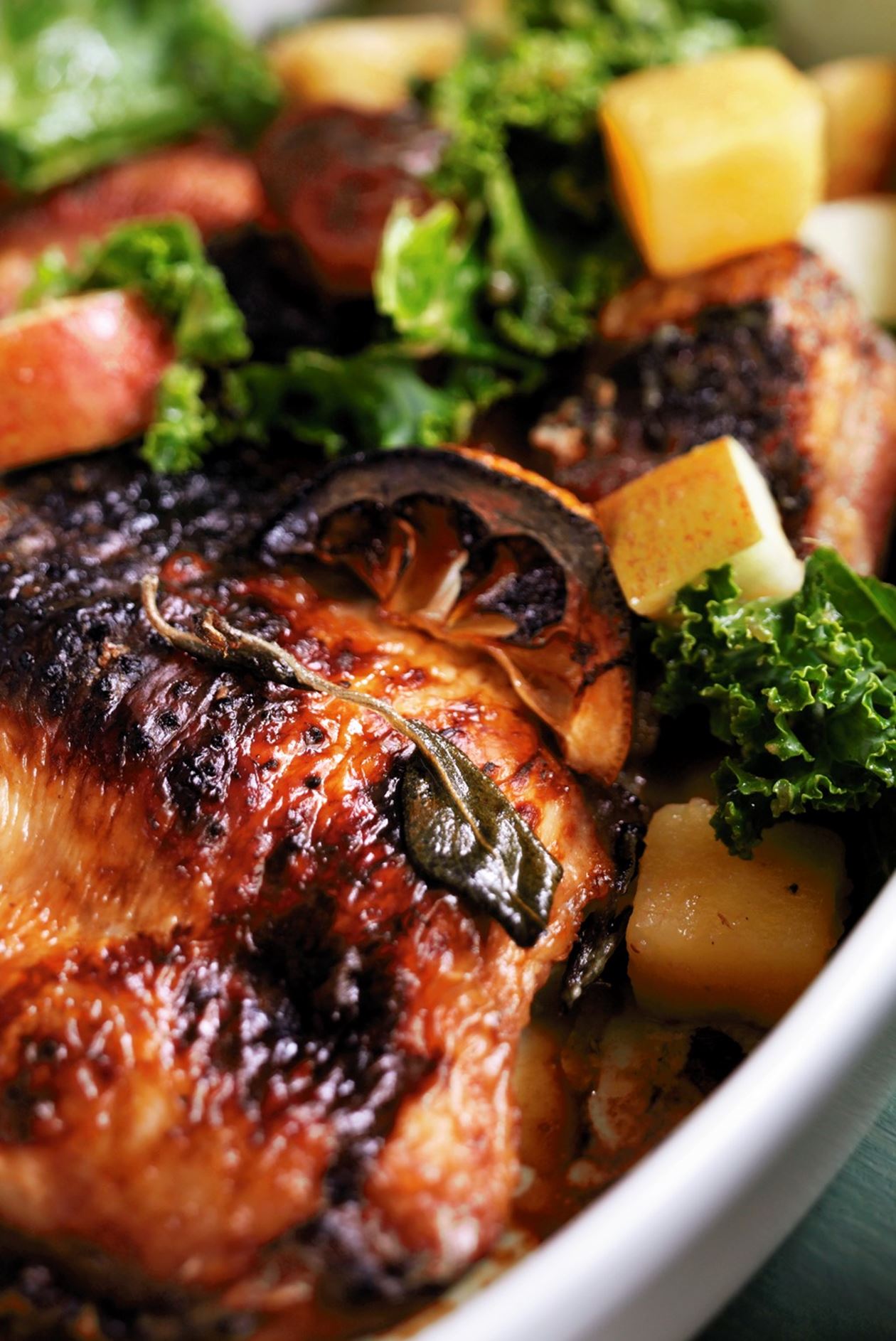 Skræl kålrabien og skær den i grove tern. Kog vand med salt op i en gryde. Når vandet koger, kommes kålrabiternene i. Kog dem i 3-4 minutter, indtil de er møre. Tag dem op og smag dem til med eddike, rapsolie, æblemos, sennep, salt og peber, mens de endnu er lune. Skyl æblerne, skær dem i kvarter, fjern kernehuset og snit dem på langs i helt fine skiver. Bland dem med kålrabiternene. Pluk grønkålen og skyl den i koldt vand. Lad den dryppe grundigt af i et dørslag og tør den herefter let i et viskestykke. Hak den fint og kom den i kålrabien. Vend det hele godt rundt og smag evt. til med lidt ekstra salt og friskkværnet peber og server med kalkunoverlårene.