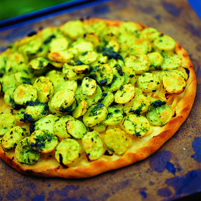Læg så kartoffelskiverne på dejen. Bag pizzaen i en forvarmet ovn på 260° i 30-35 minutter indtil pizzaen er gyldenbrun og skorpen har fjernet sig fra siderne af formen.