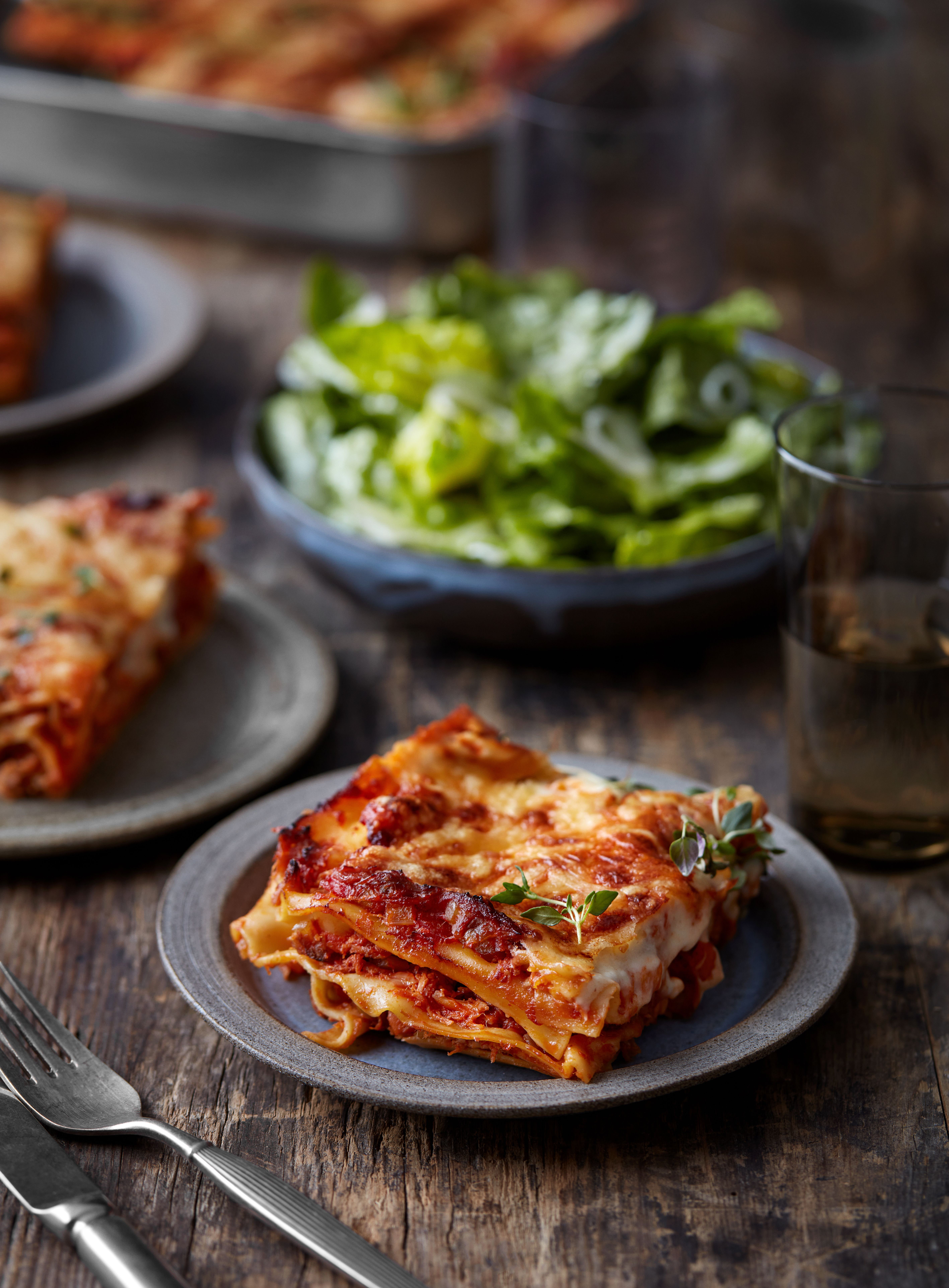Læg lasagnen sammen i et ildfast fad, med kødsauce i bunden fulgt af bechamelsauce og derefter lasagneplader. Gentag indtil al sauce er brugt og afslut med bechamel på toppen. Bag lasagnen ved 130° grader i 60 minutter. Fordel derefter mozzarellaost over og bag yderligere 15-20 minutter ved 150°.