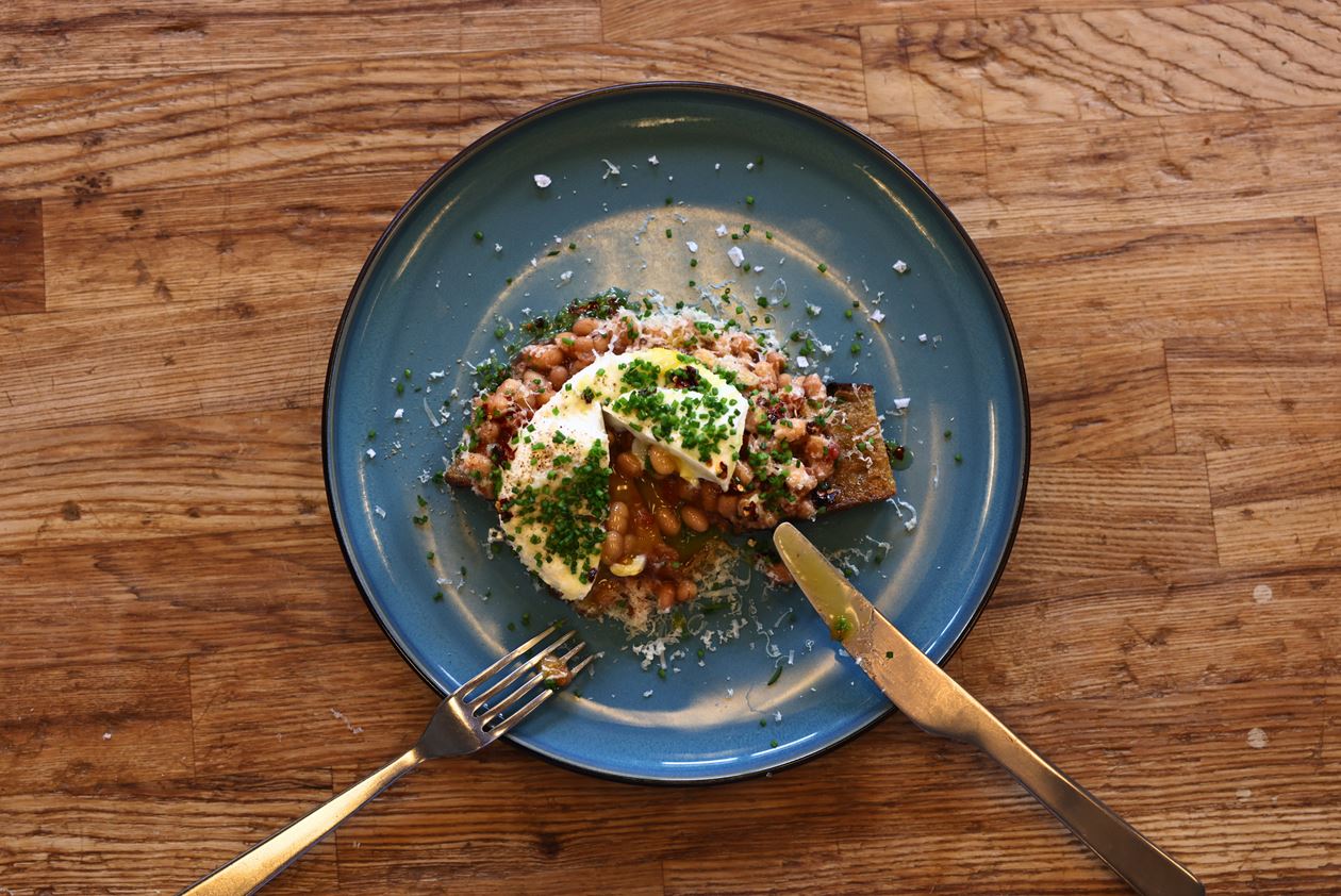 Fordel de varme baked beans på de sprøde brødskiver, og læg et pocheret æg ovenpå hver.