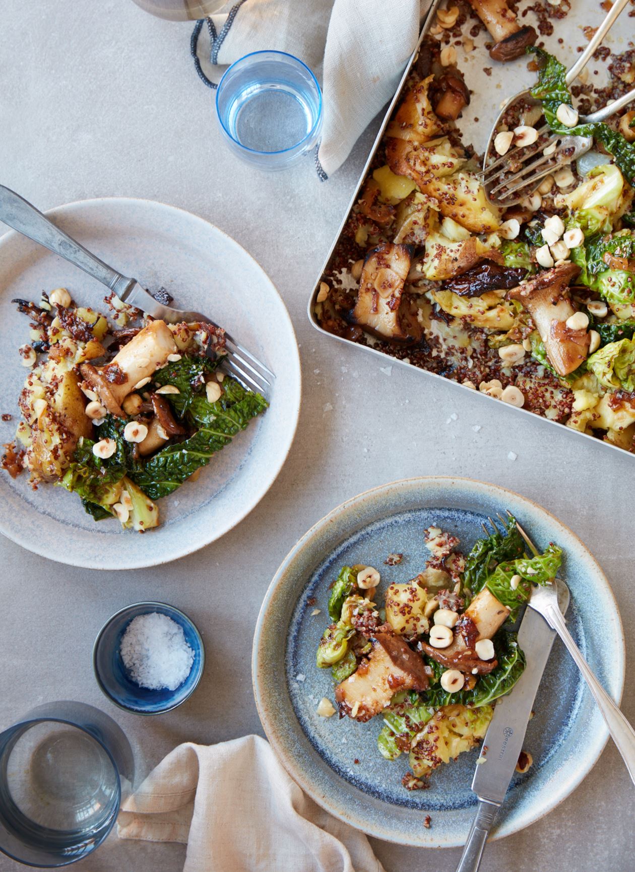 Kom de ristede og glaserede kål og svampe oven på kartoflerne, og dryp med resten af æblereduktionen. Drys med grofthakkede hasselnødder, og servér.