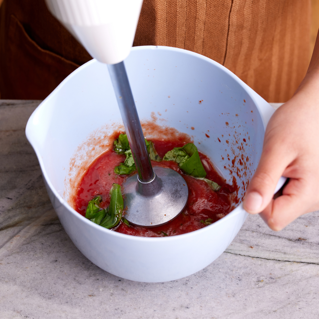 Hak løg og hvidløg groft. Sauter løgene møre i en smule olivenolie. Tilsæt hakkede tomater og lad det hele simre 20-30 minutter under låg. Tilsæt evt. vand eller grøntsagsfond så saucen ikke koger tør. Blend det hele sammen samtidig med at der tilsættes basilikum. Smag til med salt, friskkværnet peber og evt. lidt sukker. Rør til slut et par gode spiseskefulde olivenolie i saucen.