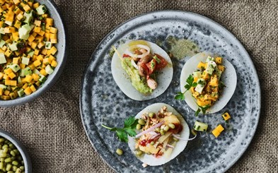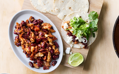 Tacos med kylling, røde bønner og ærte-mash