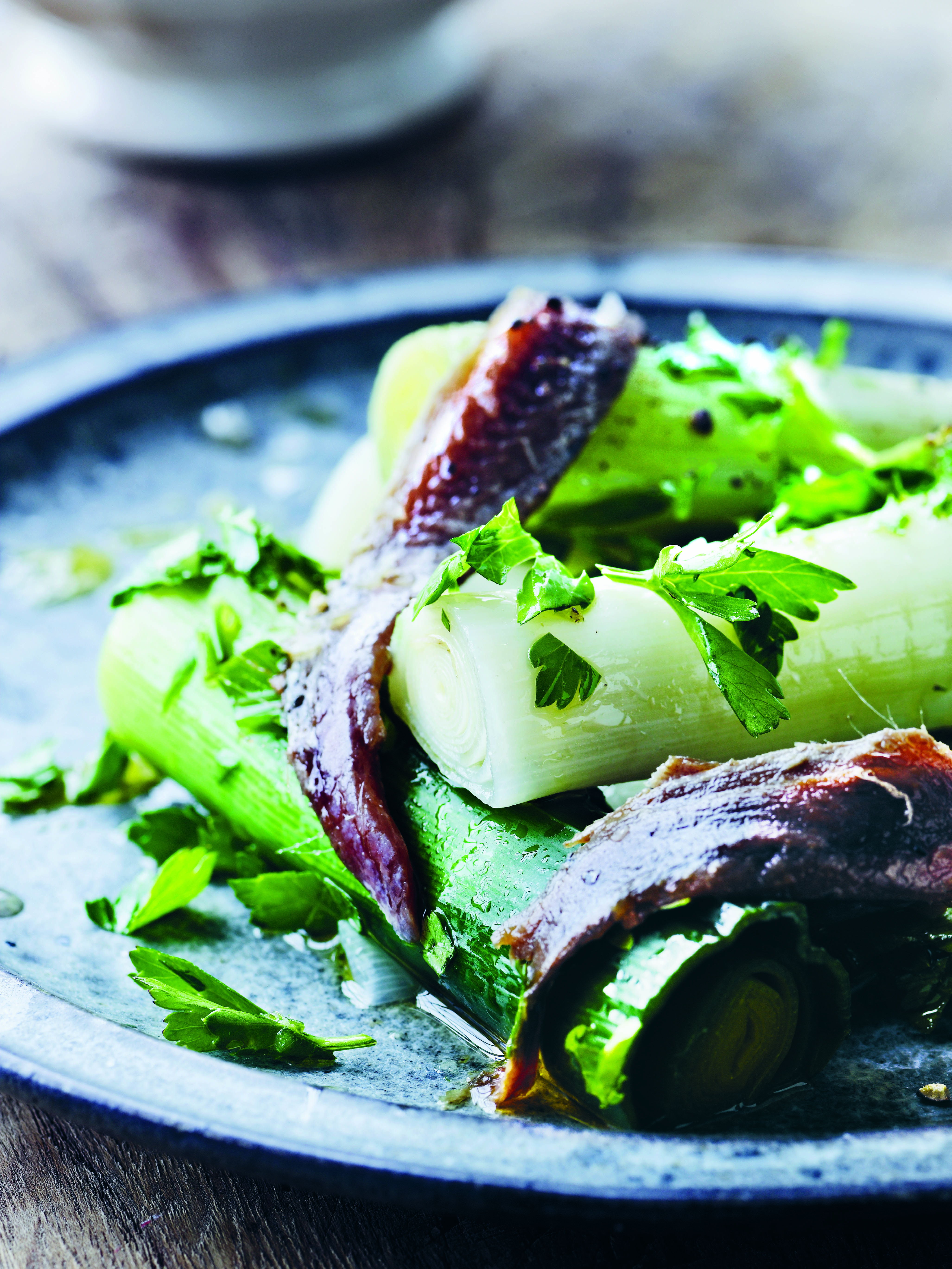 Lav en grov vinaigrette af hakket ansjos, kapers, sennep, plukket persille, eddike, honning og rapsolie, og rør det godt sammen. Fisk de møre porrer op af vandet, og kom dem direkte over i vinaigretten, så de suger smag til sig. Vend dem rundt, og smag dem til med salt og peber.