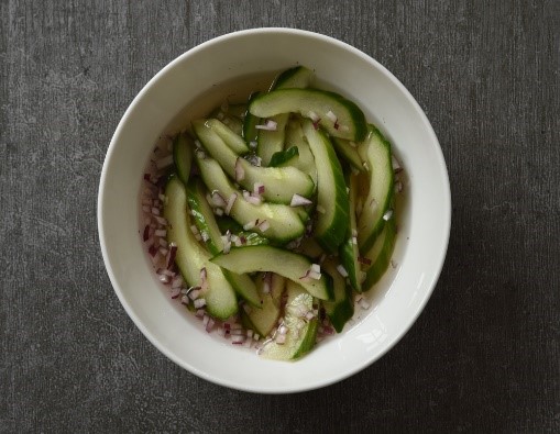 Del agurkerne på langs og skrab kernerne ud med en teske. Skær agurken i tynde skrå skiver på 2-3 mm. Opløs eddike og sukker i det kogende vand og tilsæt/smag til med salt og peber. Kom agurkeskiverne og de finthakkede løg i den afkølede dressing. Lad den trække 15-20 minutter, drys med korianderblade.