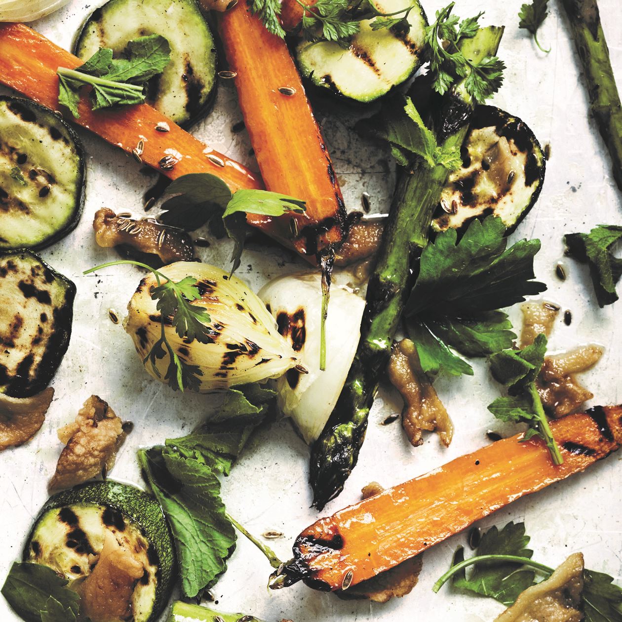 Bland alle ingredienserne og blend til en flydende dressing, herefter hælder du den over de stegte grøntsager og flækærter, og vender det sammen til en samlet ret.