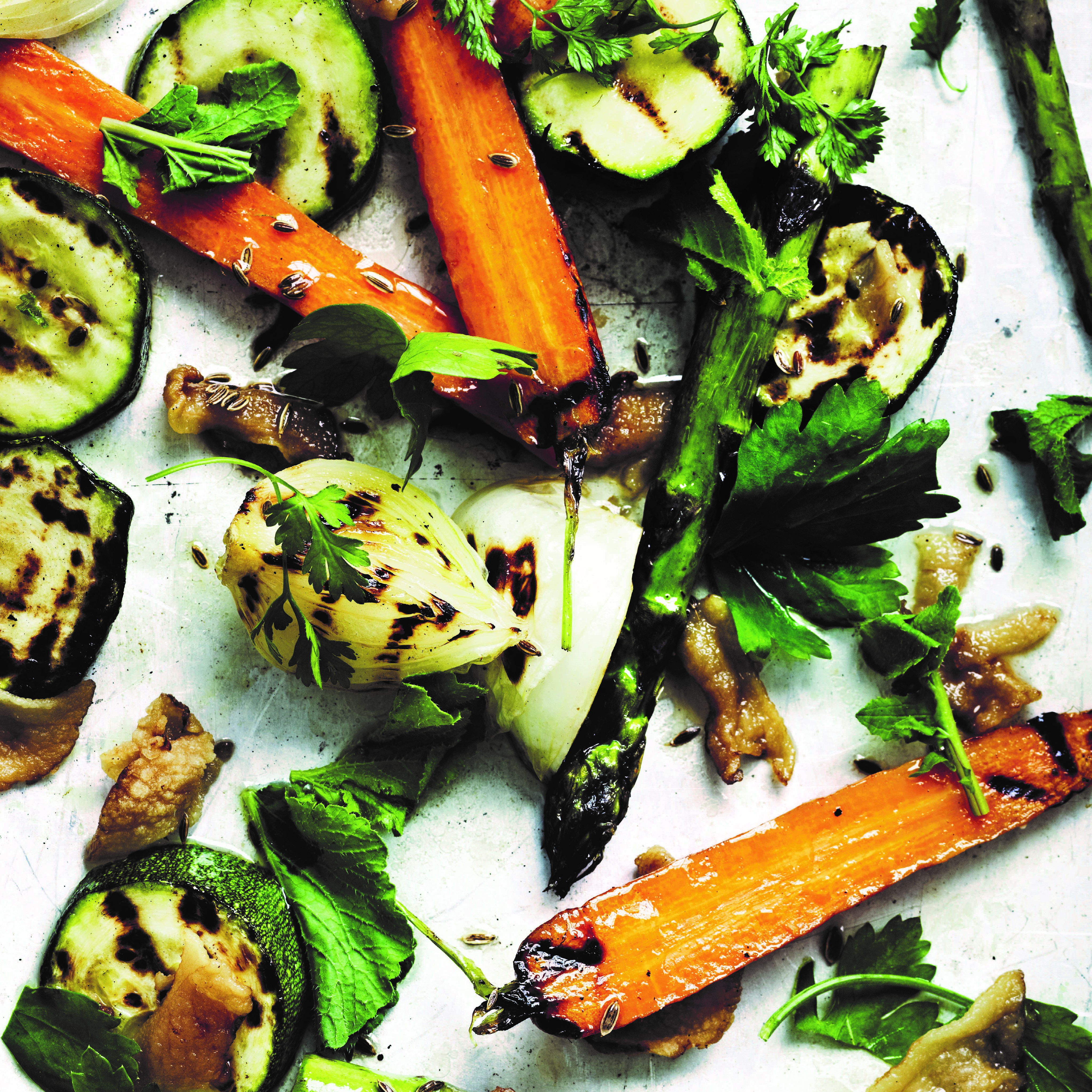 Bland alle ingredienserne og blend til en flydende dressing, herefter hælder du den over de stegte grøntsager og flækærter, og vender det sammen til en samlet ret.