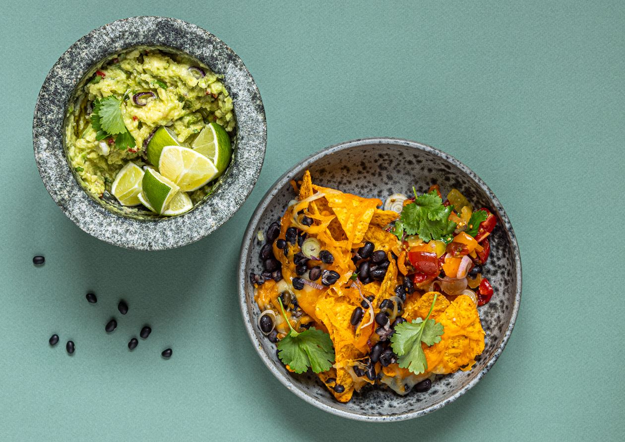 Fordel nachos-chips på en bageplade. Top med sorte bønner og revet cheddar. Bag i ovnen ved 180 °C, indtil osten er smeltet og nachos er gennemvarme.