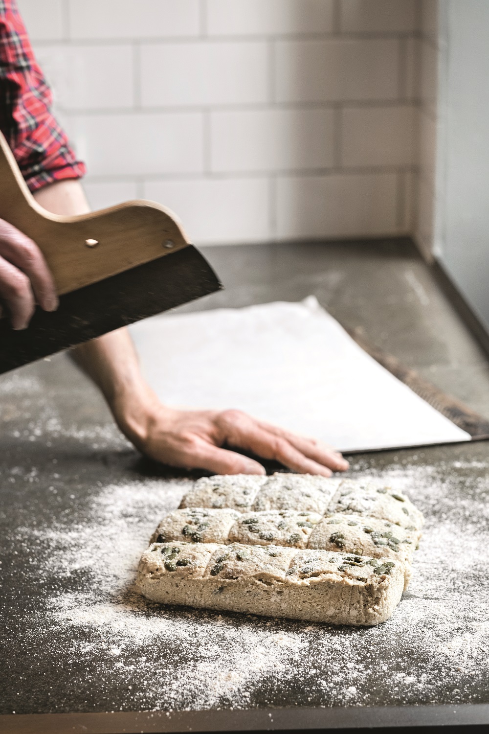 Bland smør, sukker, hakkede mandler, æg og hvedemel, med den afkølede vaniljecreme. Hvis du har en sprøjtepose, kan du med fordel komme massen deri, til den skal bruges.