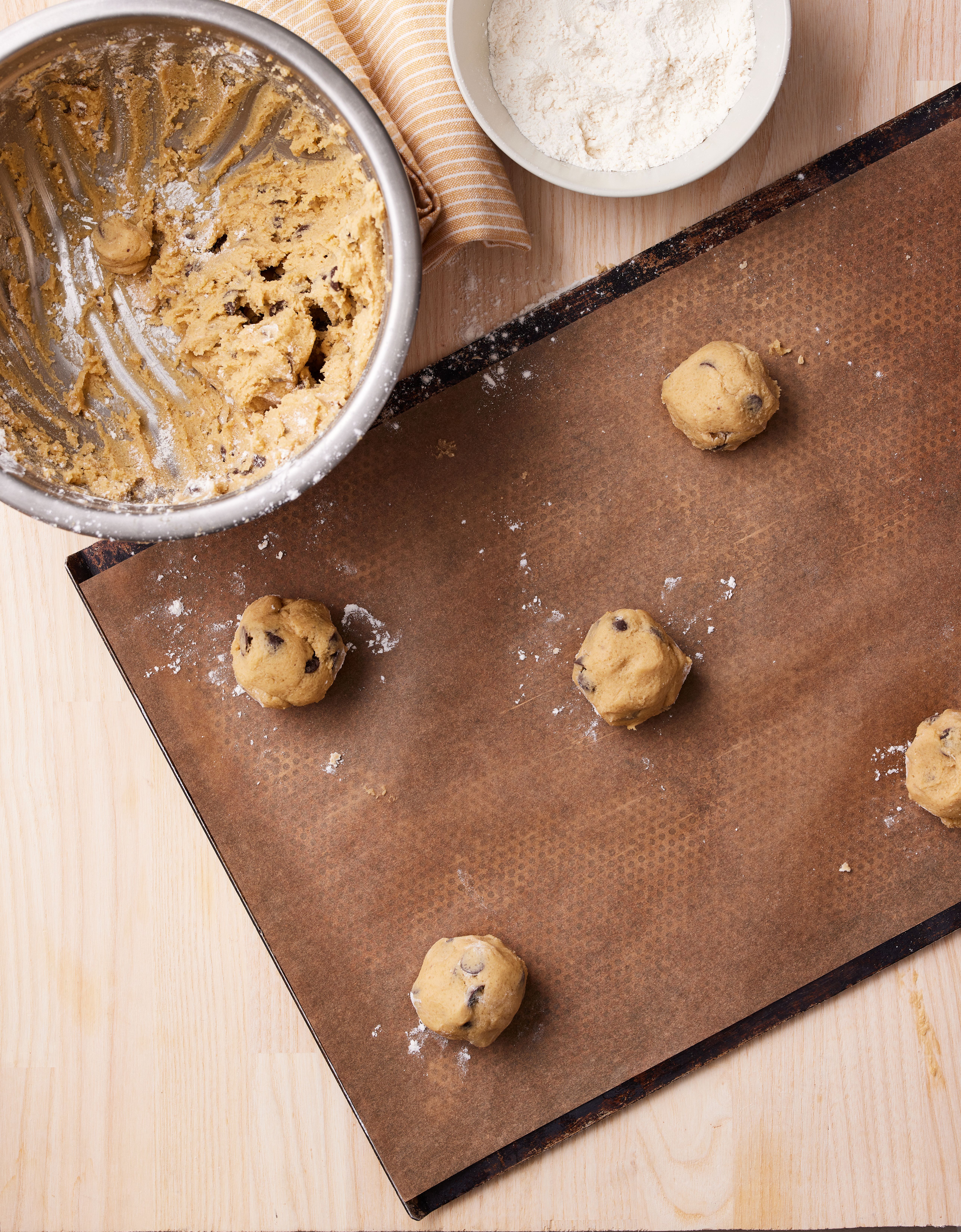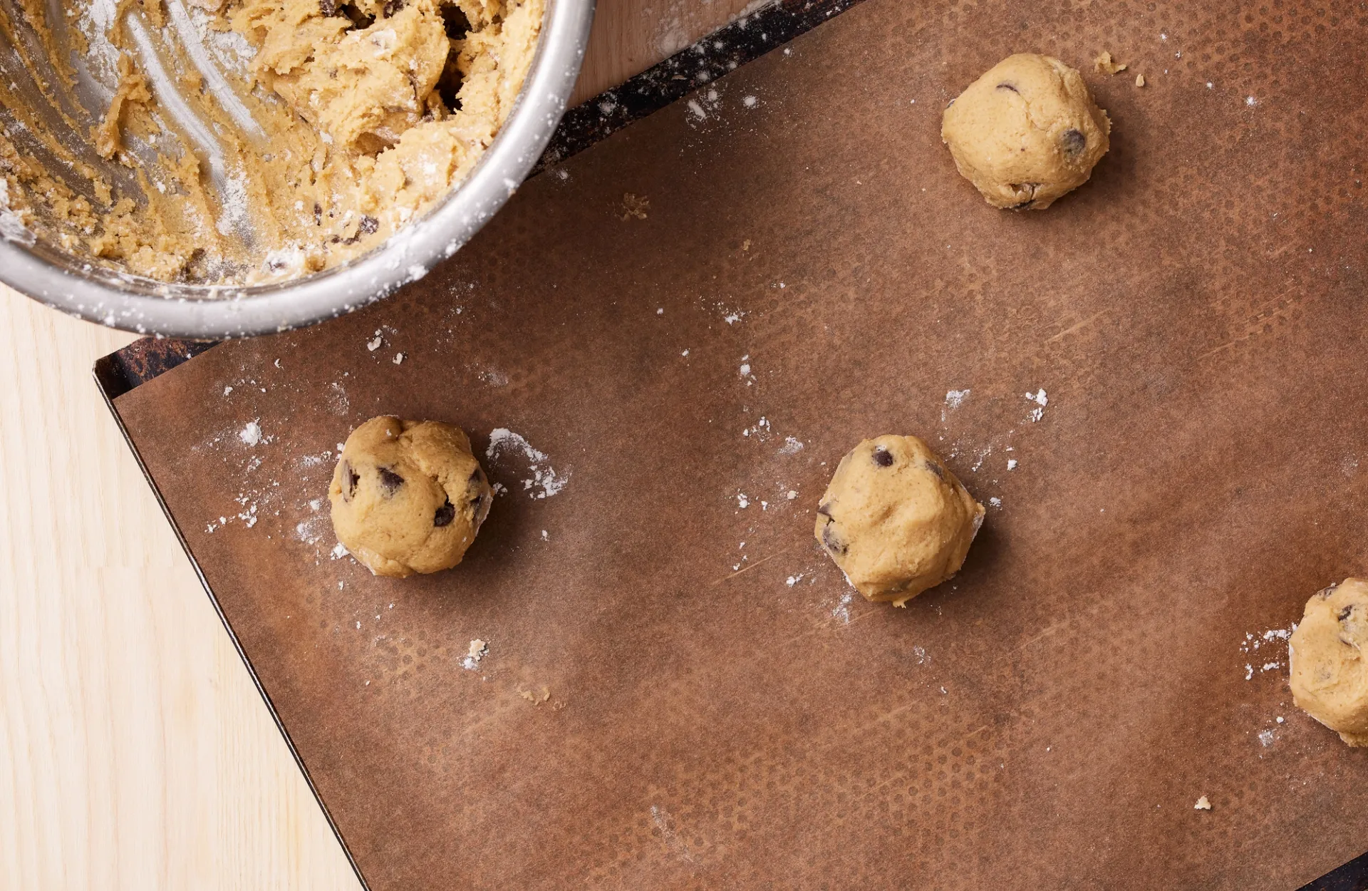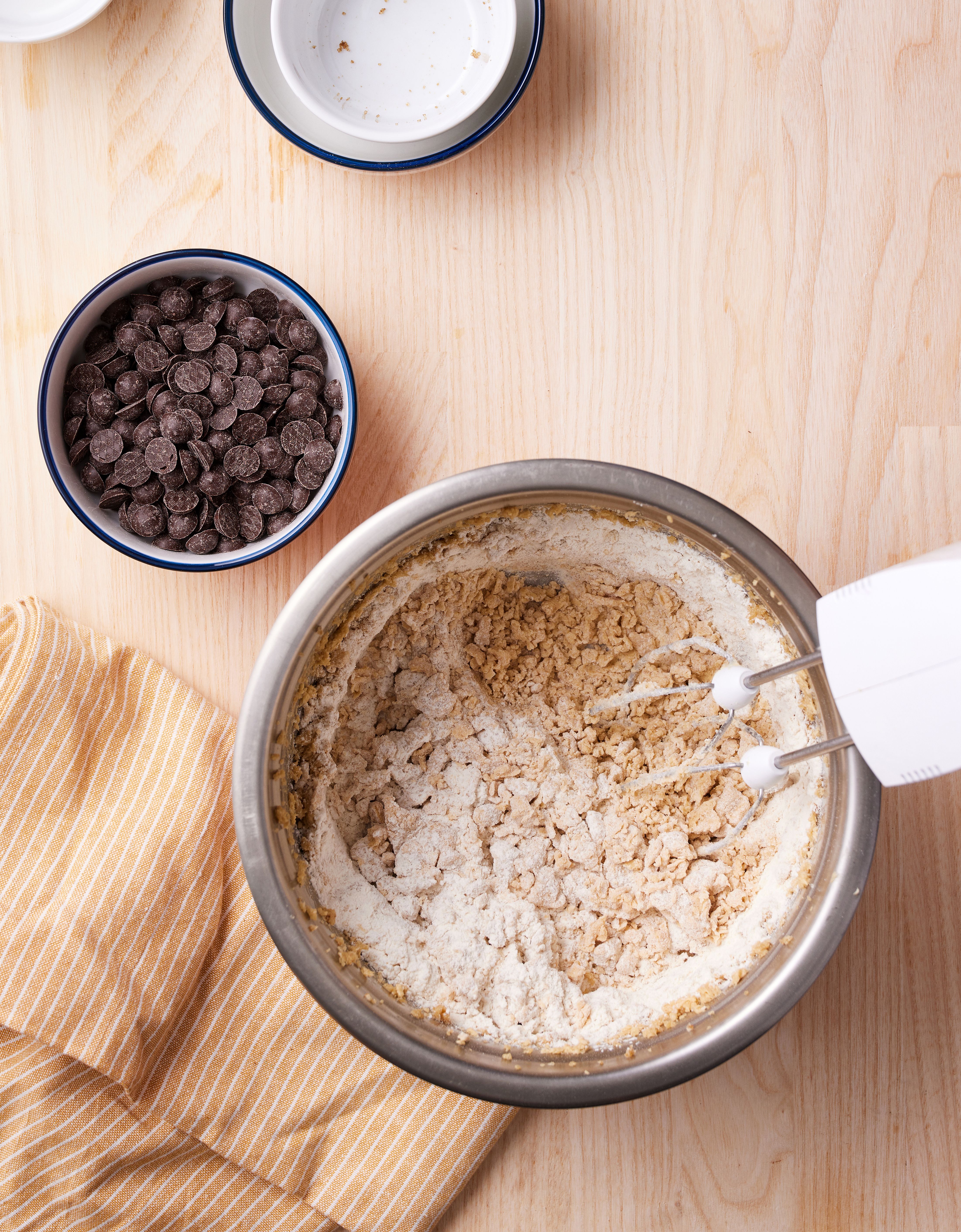 Bland mel, natron og salt sammen i en skål, og sigt det i smørblandingen. Rør dejen godt sammen, og tilsæt til sidst den hakkede chokolade.