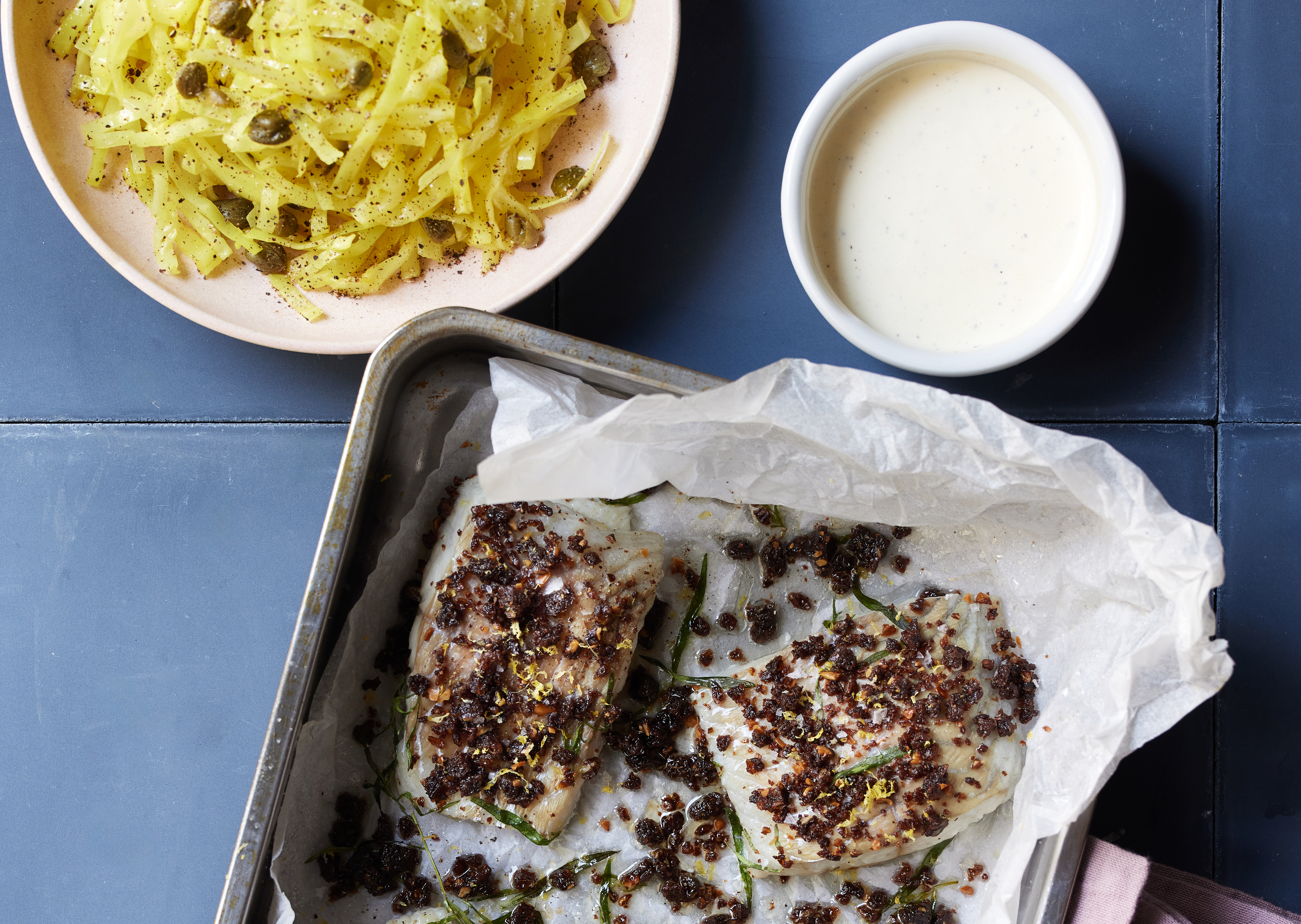 Skær fisken i portionsstykker, og læg dem i et ovnfast fad eller på en bageplade med bagepapir. Krydr let med salt og peber, og fordel rugknasen på fisken sammen med estragonblade.