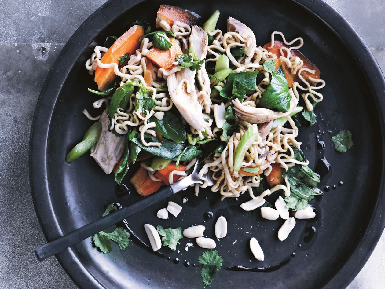 Vend nudlerne med grønsager, kylling og marinade, og smag til med salt og peber. Pluk basilikum og koriander groft, og drys krydderurterne og jordnødderne på toppen af salaten.