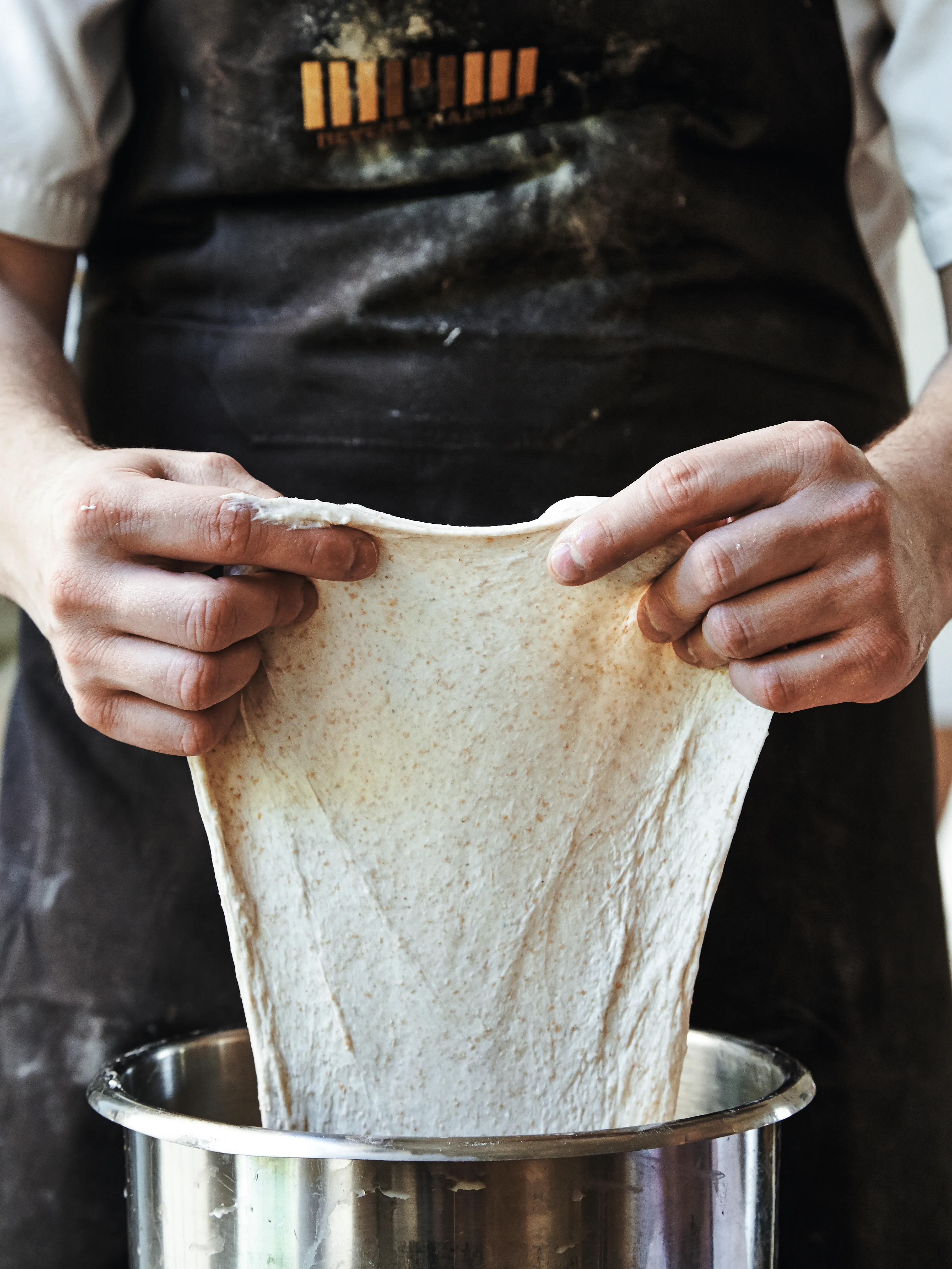 Tag et stykke dej og stræk det helt ud, til det bliver så gennemsigtigt som pergamentpapir, uden at det går i stykker – det kalder man en glutentest. Så er dejen optimalt æltet og klar til hævning. Går dejen i stykker når du trækker den tyndt ud, skal den æltes noget mere.