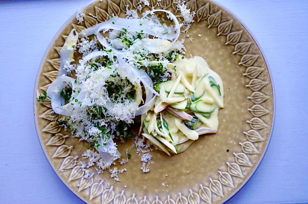 Skræl de hvide asparges. Skær dem på langs i 1 cm tykkelse. I en sauterpande varmes veloutéen op. Hak estragon og persille fint. Kom asparges og saltede citroner i veloutéen og kog op, sluk herefter og tilføj de friskhakkede urter og syltede løg. Smag til med æbleedikke, salt og peber.