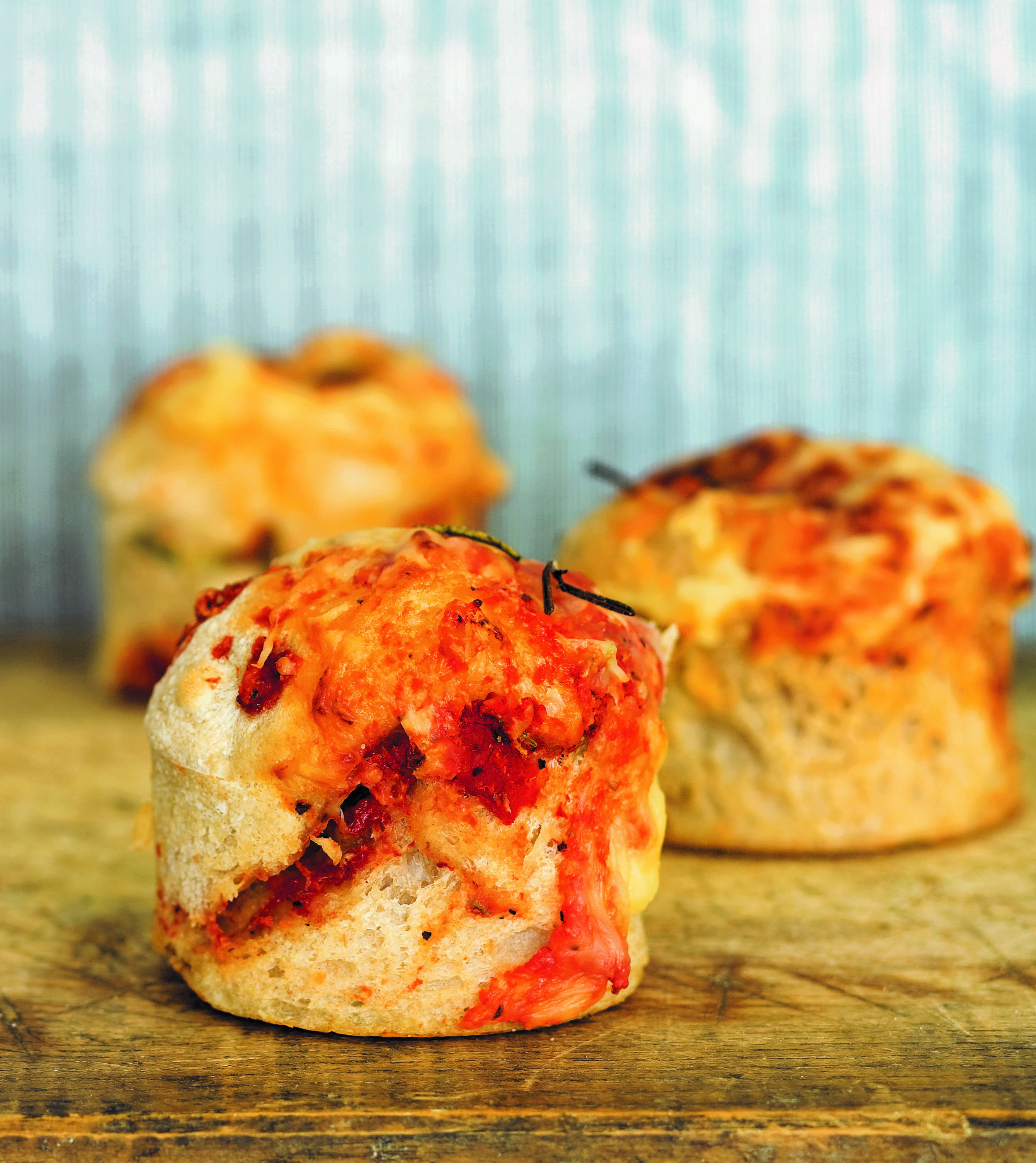 Læg dejen på et melet bord, og tryk den ud til et rektangel på ca. 40 x 20 cm. smør tomatsauce på dejen, men efterlad 1 cm ren kant øverst oppe. Tag lidt af comtéosten fra til at drysse sneglene med senere, og fordel resten over tomatsaucen. Rul dejen sammen som en roulade, så dejen uden tomatsauce kommer til at ligge yderst. skær dejpølsen i 2-3 cm brede snegle, og fold dejsnippen uden tomatsauce ind under sneglene, så du undgår at sneglene går op under bagningen. sæt sneglene i papirforme eller i smurte bageringe, og drys resten af osten og lidt frisk rosmarin på toppen. Lad sneglene hæve 6-10 timer (evt. natten over) i køleskabet.