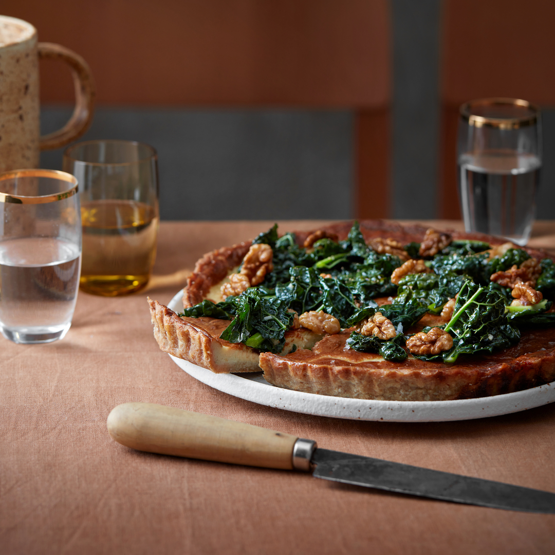 Fordel kålen på tærten sammen med grofthakkede ristede valnødder.