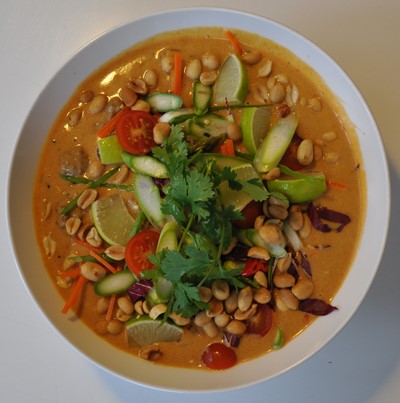 Kom kokosmælken i og derefter jordnøddesmørret under omrøring. Tilsæt/smag til med fiskesovs og sukker. Fortynd evt. sovsen med lidt vand – den må ikke være for tyk. Kom kødbollerne i sovsen og lad dem trække. Retten kan med fordel tilberedes dagen før. Opvarm retten inden servering, anret på et fad, drys jordnødder over og servér varm med agurkesalat og ris.