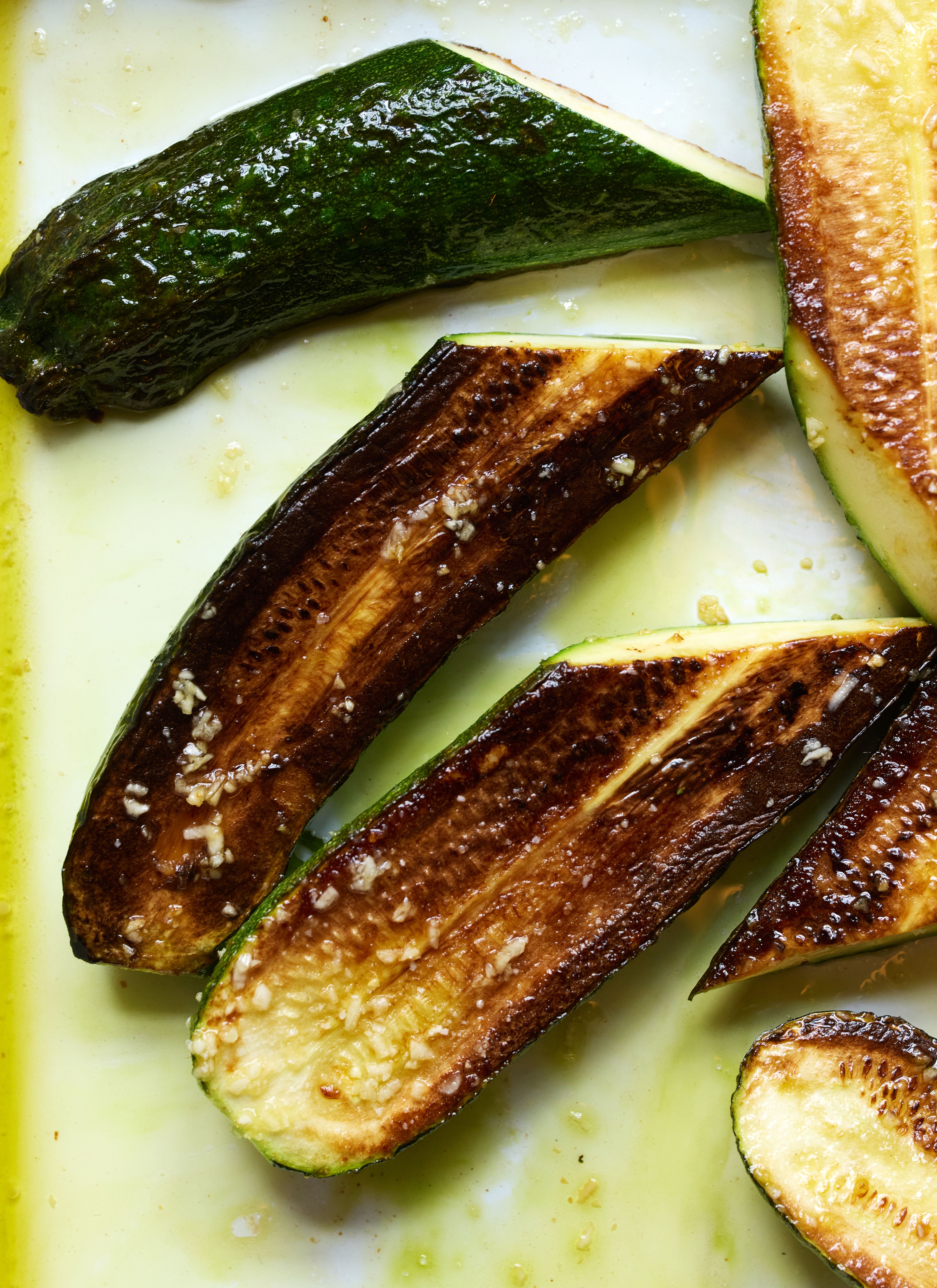 Skær squashene i tynde skiver, og rist dem i cirka ½ dl olivenolie i en stor pande eller bredbundet gryde. De må gerne få godt med farve, men skal stadig have noget bid – ca. 4 minutter på hver side ved mellemhøj varme. Mens squashene rister, så hak løg og hvidløg, og lad dem stege med et par minutter, til løgene er møre, inden du tilsætter revet citronskal, chiliflager, fløde og cirka halvdelen af citronsaften. Lad det simrekoge i 3-4 minutter til en sammenhængende sauce.