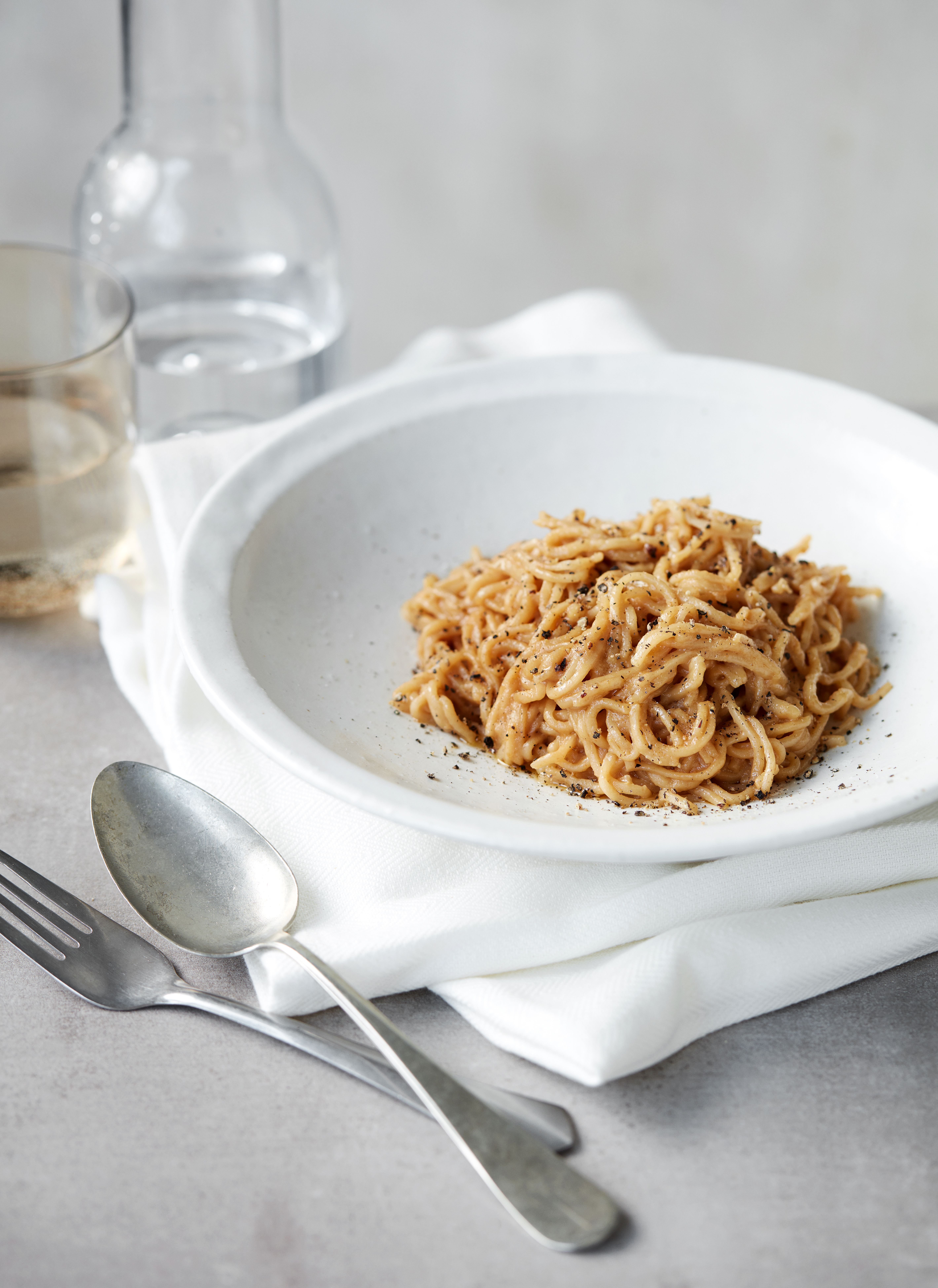 En enkel pastaret, hvor pastaen tager smag af en sauce, der laves i panden, mens pastaen koger. Det er simpel og hurtig hverdagsmad, der kan varieres i det uendelige. Alligevel kræver det koncentration – en god ristning af grøntsagerne, præcis kogning af pastaen og en omhyggelig tilsmagning skal til for, at det bliver rigtig godt.
