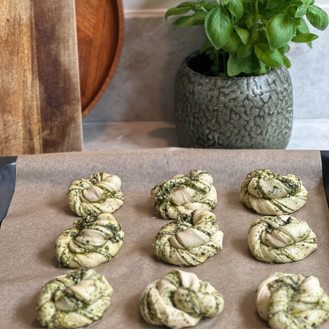 Vend dejen ud på et meldrysset bord, og rul den ud til et rektangel på ca. 30x60 cm. Smør basilikumspesto ud over dejpladen med en dejskraber, så det er jævnt fordelt. Fold en tredjedel af dejen ind mod midten, og fold den anden tredjedel indover den første, så du har 3 lag dej. Rul nu dejen ud igen til ca. 30x30 cm, og skær den i 12 strimler, der er 30 cm lange og ca. 2,5 cm brede.