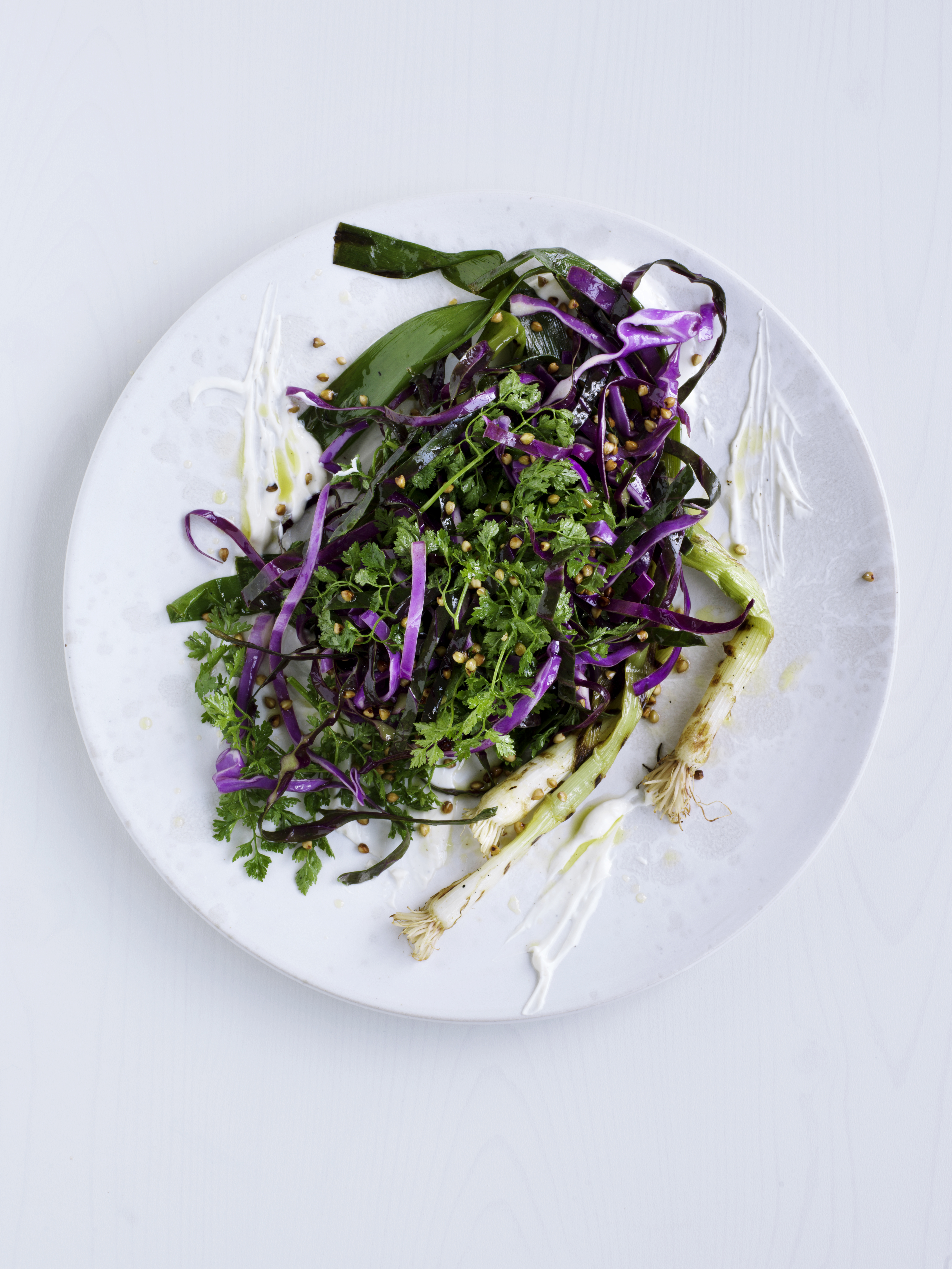 Rør den drænede tykmælk med salt, peber, sukker og citronsaft. Vend kål og kørvel med de syltede løg – inklusiv marinaden. Krydr med salt og peber. Smør tykmælksdressingen ud på et fad, og anret salaten oven på. Drys til sidst med de sprøde kerner.
