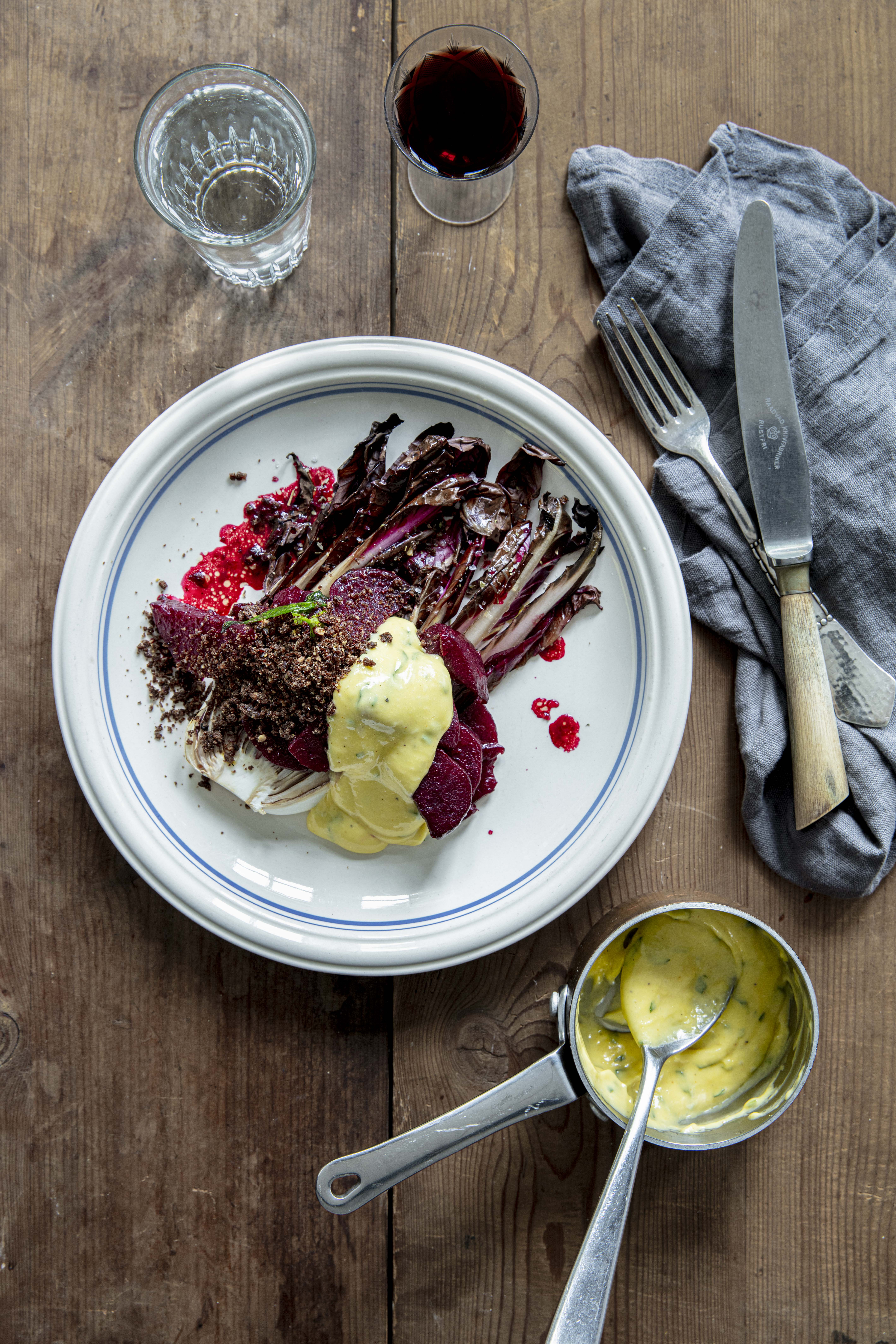 På den grillede radicchiosalat lægges de lune rødbeder, som derefter toppes med bearnaise sauce, rugbrødsdrys og estragon.