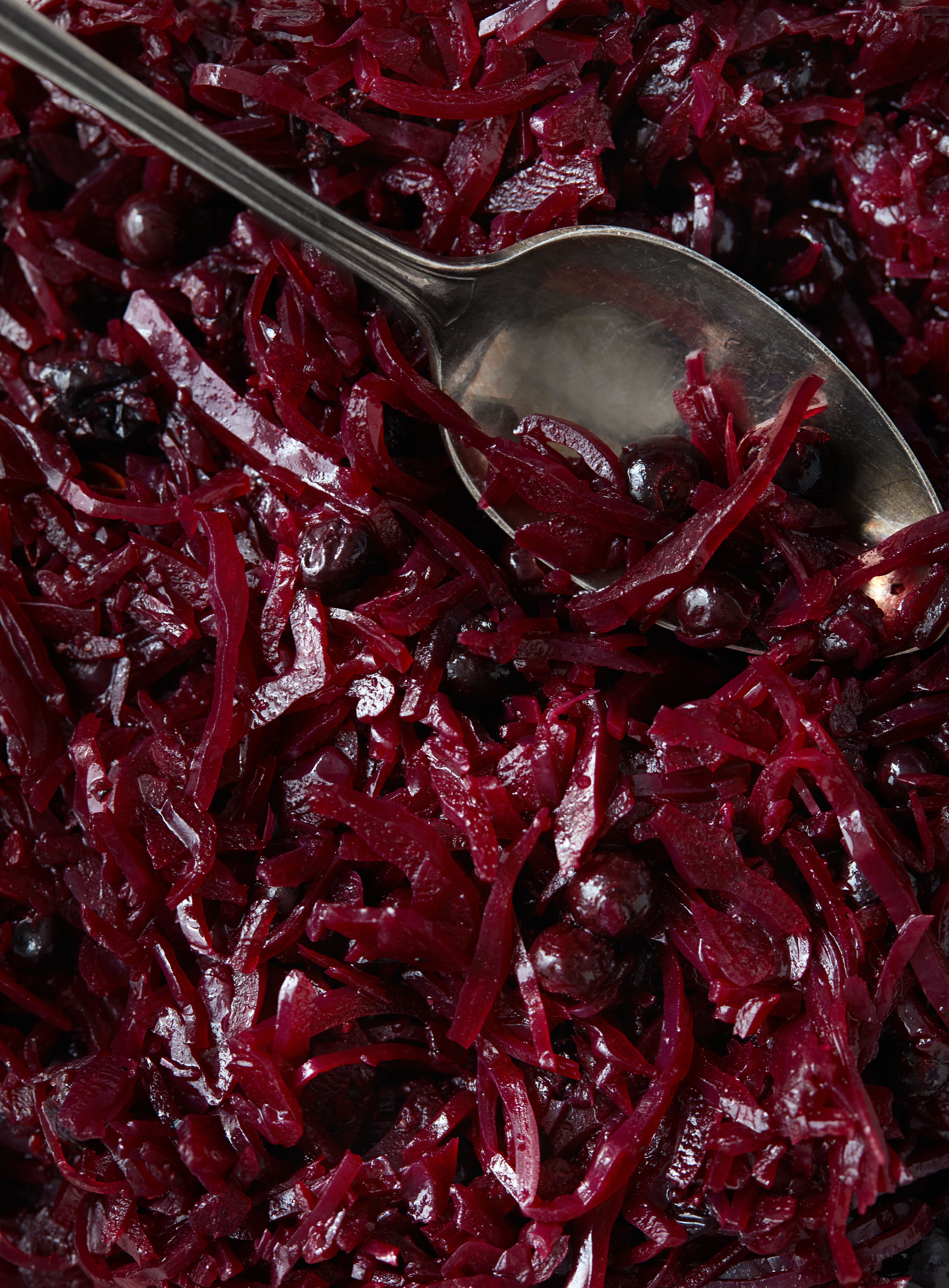 Skær rødkålen i kvarter, snit den helt fint og steg kålen af i andefedtet ved jævn varme. I en anden gryde skal du bringe eddiken i kog sammen med sukker og resten af ingredienserne. Hæld den varme lage over kålen, lad det hele småsimre i en lille time til det er færdigt.