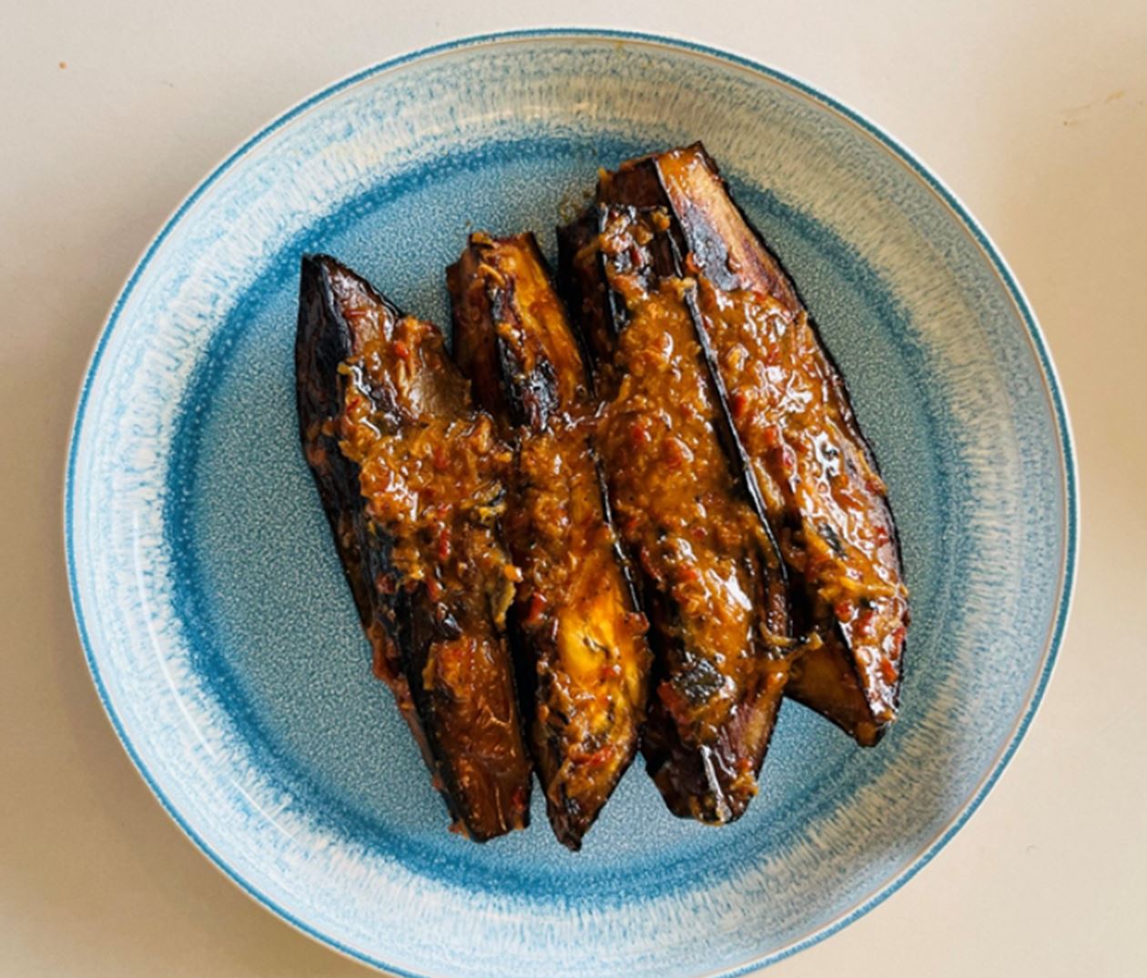 Steg auberginerne i lidt olie på en pande. Tilsæt hakket hvidløg og sambal og kog det sammen med kokosmælk.
