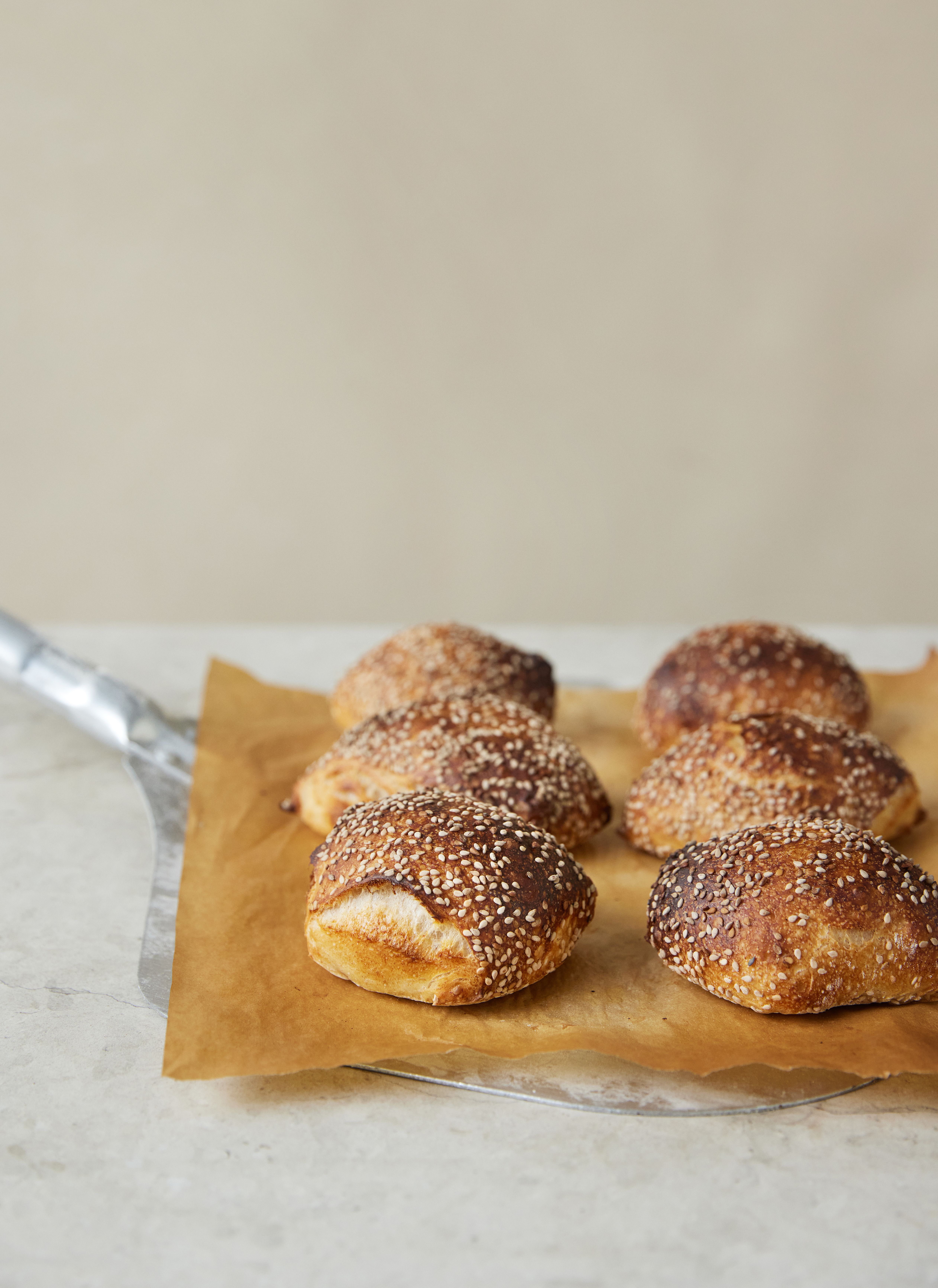 Friskbagte sesamboller har noget weekendagtigt over sig. De her indeholder to meltyper, der tilsammen giver en luftig og velsmagende krumme, der vil gå perfekt til ost, marmelade eller bare smør.
