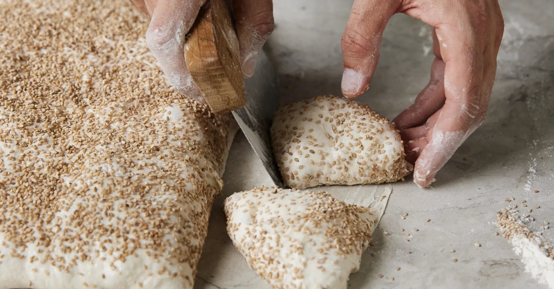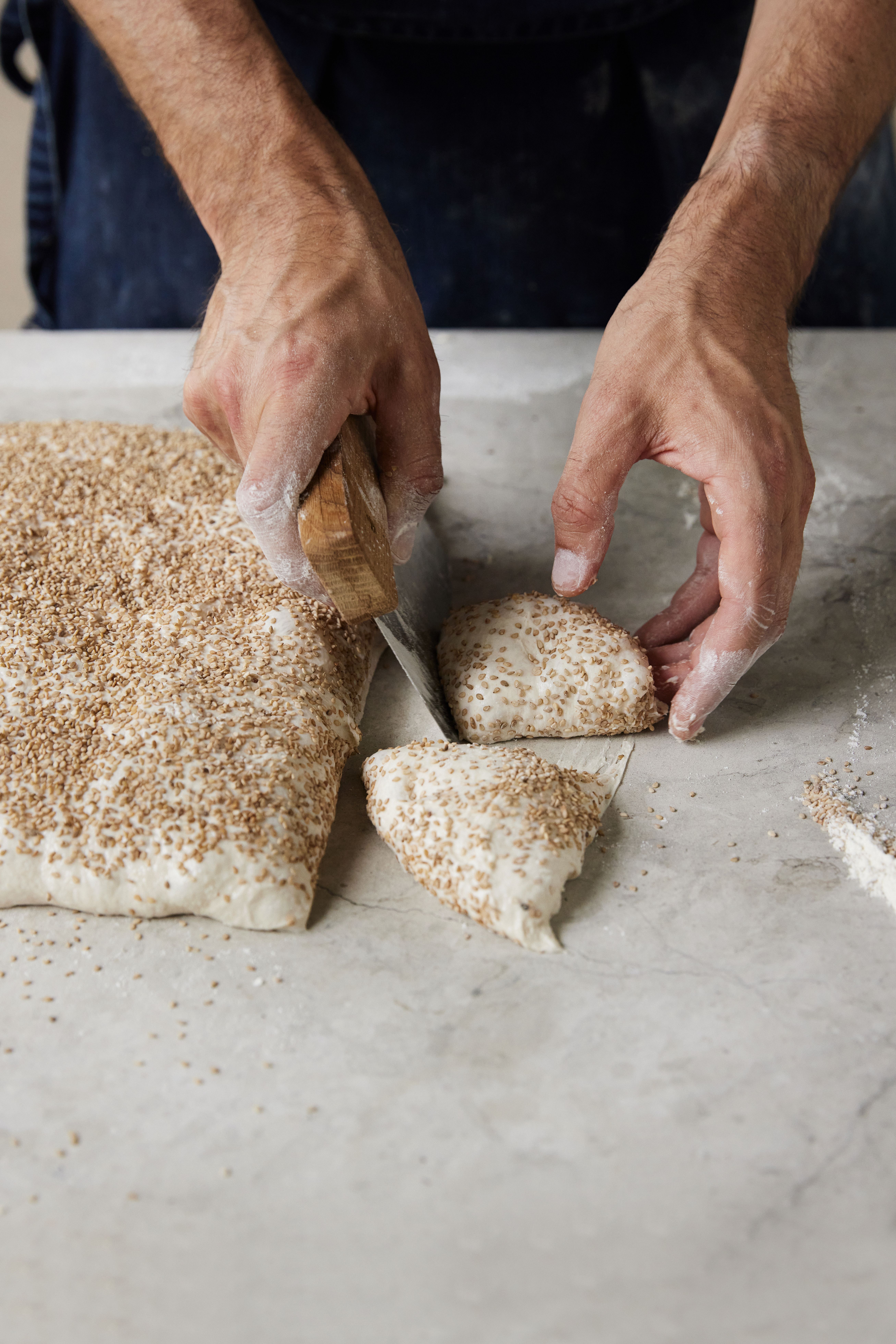 Kom mel på hænderne, og spred forsigtigt dejen en smule ud til et rektangel med en jævn tykkelse, uden at strække for meget i den. Drys hele overfladen med sesam, og hak beslutsomt seks ensartede boller ud, og løft dem med den ene hånd, assisteret af dejhakkeren i den anden hånd, over på pladen med bagepapir.