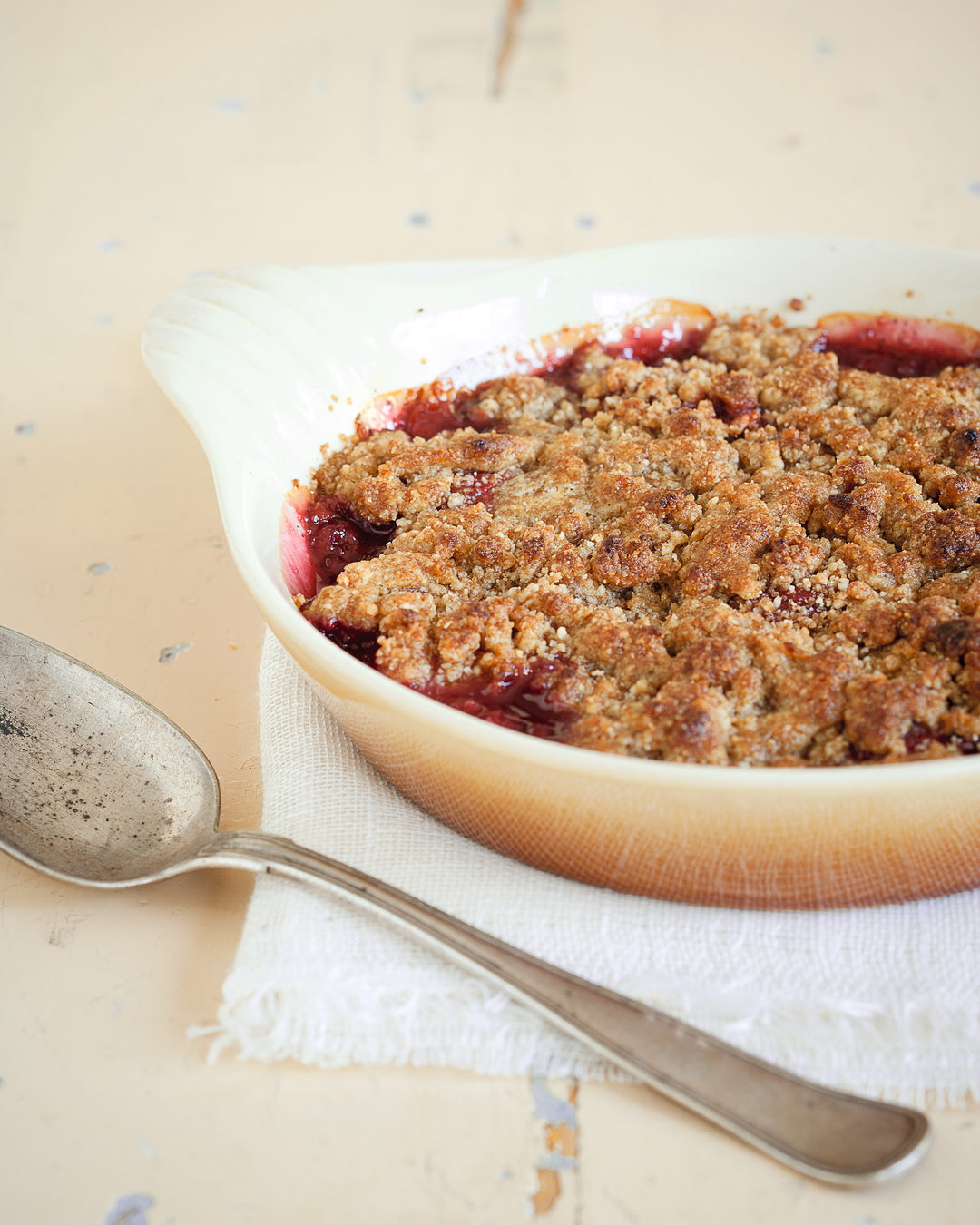 Lav en smuldredej. Kom hvedemel, mandelmel og smør i en stor skål, og gnid det hele sammen til krummer – dejen må ikke hænge sammen. Kom brun farin i til sidst, så sukkeret lægger sig lækkert rundt om dejkrummerne. Fordel crumbledejen over blommerne, og bag dem i ca. 25 minutter, eller indtil dejen har fået en flot gylden farve.