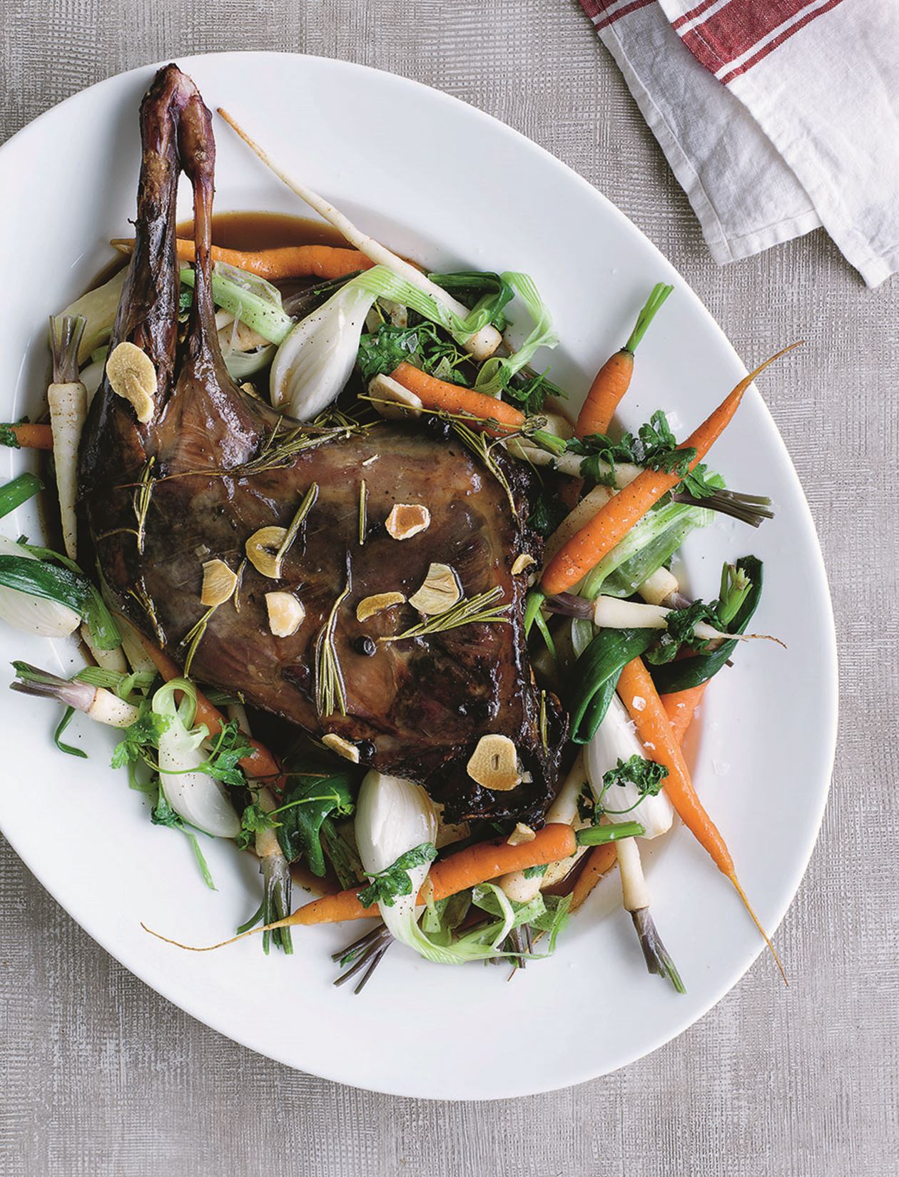 Skræl og skyl rodfrugterne og løgene, og skær dem på langs, så du får nogle flotte lange grønsagsstykker – gem gerne lidt af toppene fra løgene, persillerødderne og gulerødderne. Vend grønsagerne med lidt olie og salt. Rist dem på skærefladen på en varm, tør pande, til de har fået en flot, mørk overflade. Efter ca. 1½-2 time i ovnen kommer du grøn- sagerne ned i gryden med kødet og tager samtidig låget af. Vend grønsager og kød regelmæssigt under den sidste halve times braiseretid, så kød og grønsager får en flot overflade. Hvis fordampningen af væsken har været for voldsom, tilsætter du mere væske. Du skal ende med ca. 6 dl kraftig sky. Sigt skyen over i en ren gryde. Og hold kød og grønsager varme.