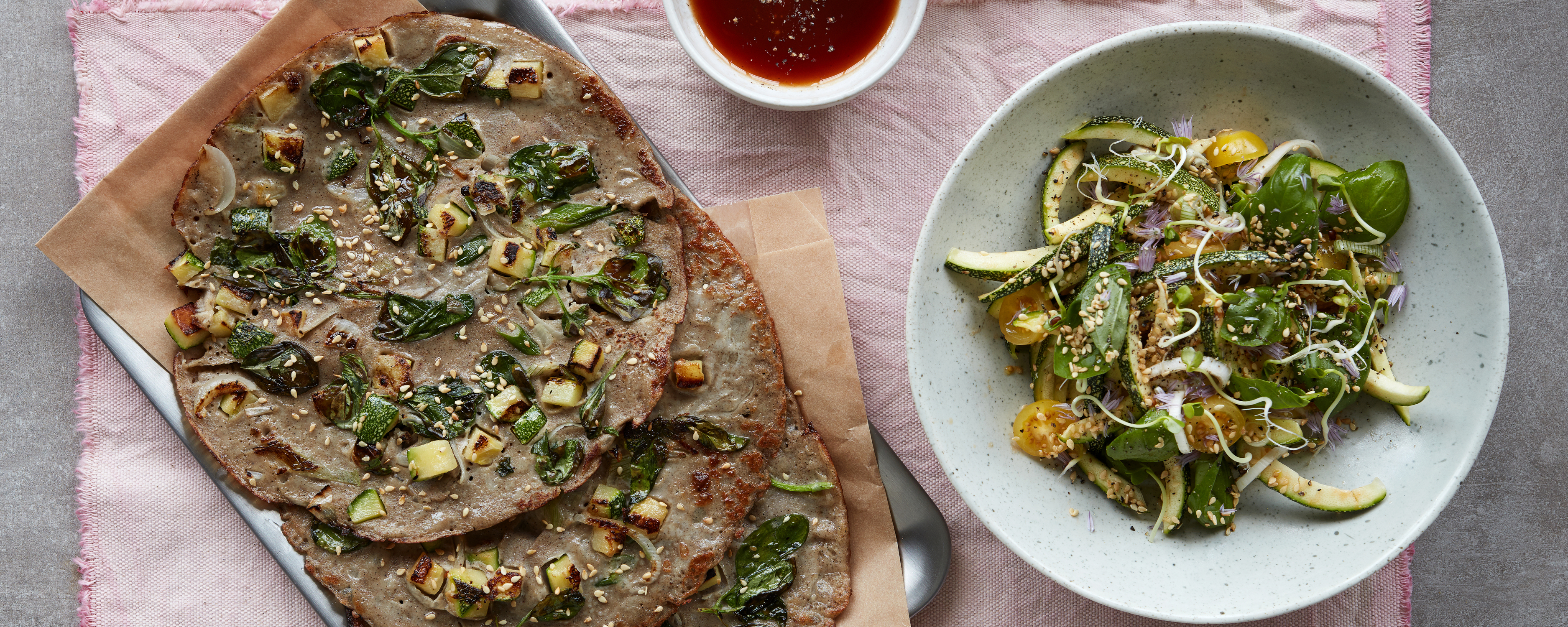 Varm en pande op til mellemvarme med lidt olie. Kom 2 spsk. ristet squash og løg på panden sammen med nogle basilikumblade og ca. 3⁄4 dl pandekagedej, og vip panden, så dejen fordeles. Bag i 45 sekunder på hver side. Der bør være dej til ca. 12 pandekager.