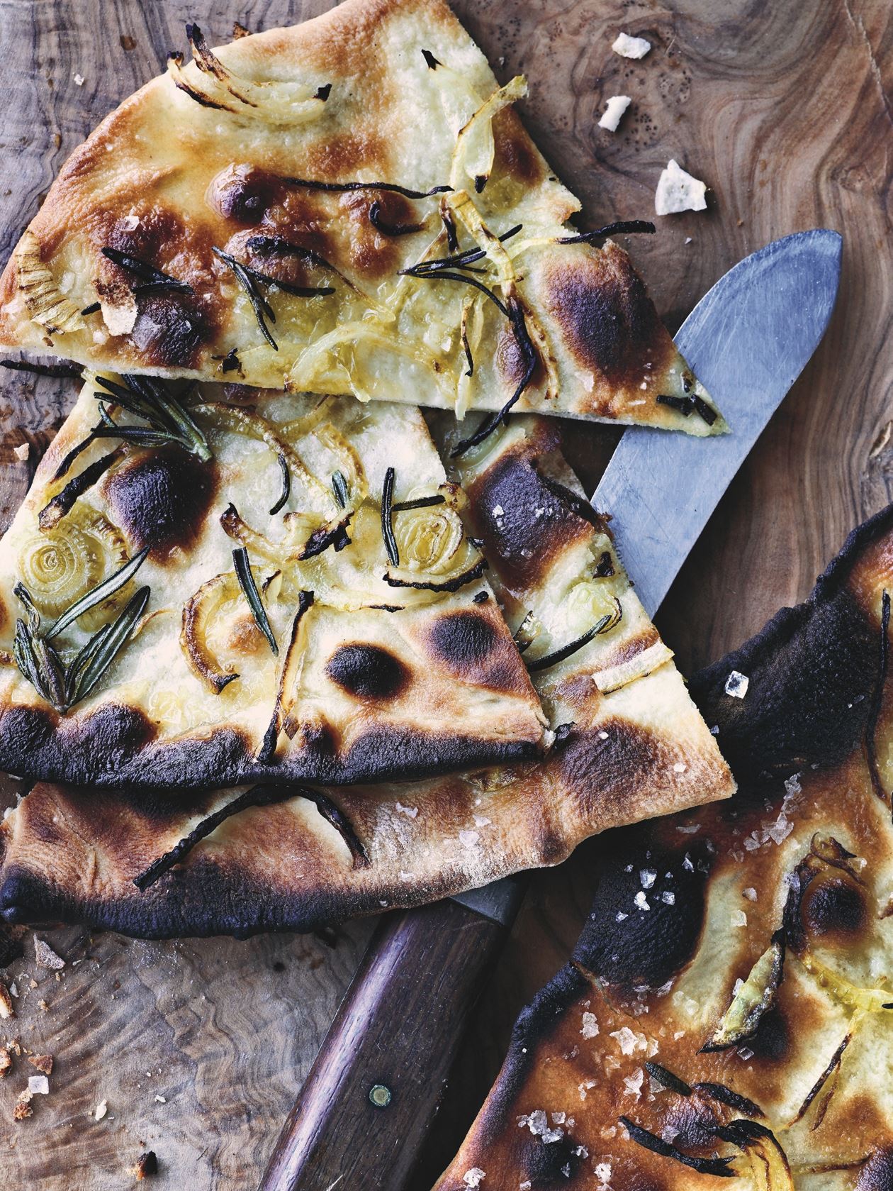 Pil løgene og skær dem ud i helt tynde ringe. Fordel løgringene ud over bunden, dryp med olivenolie, og drys med rosmarin og salt. Tag den varme bageplade ud af ovnen, og løft eller træk bagepapiret med tærten på over på den. Kom tærten i ovnen, og bag den i 7-9 minutter, så bunden bliver helt sprød og mørkgylden.