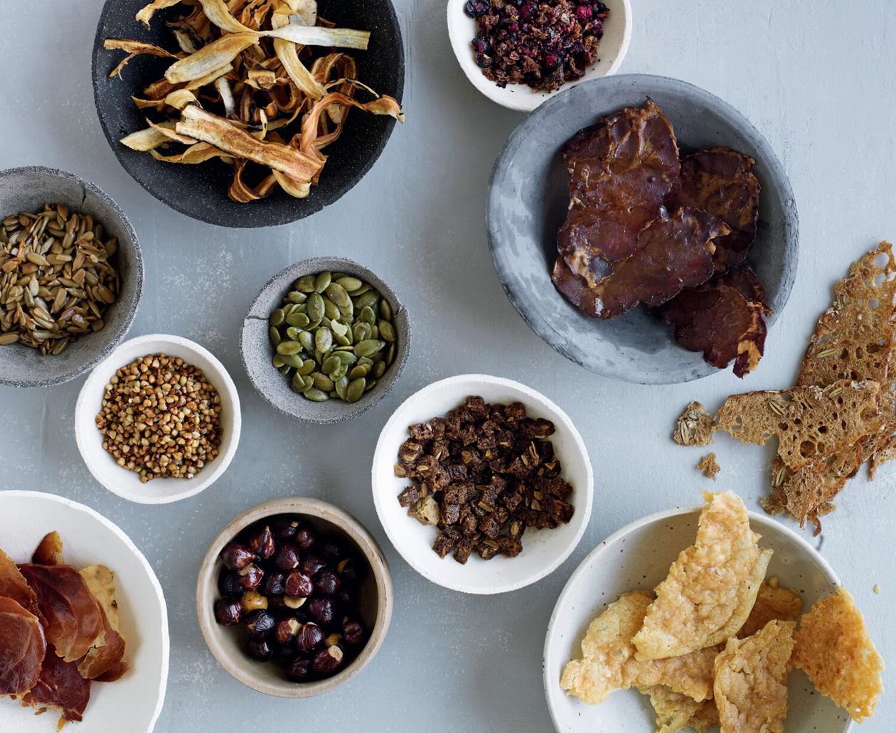 Spred kyllingeskindet ud på en bageplade, og drys med ganske lidt salt. Rist skindet i ovnen ved 150° i 3035 minutter, til det er knasende sprødt. Læg det på køkkenrulle, indtil du skal bruge det.