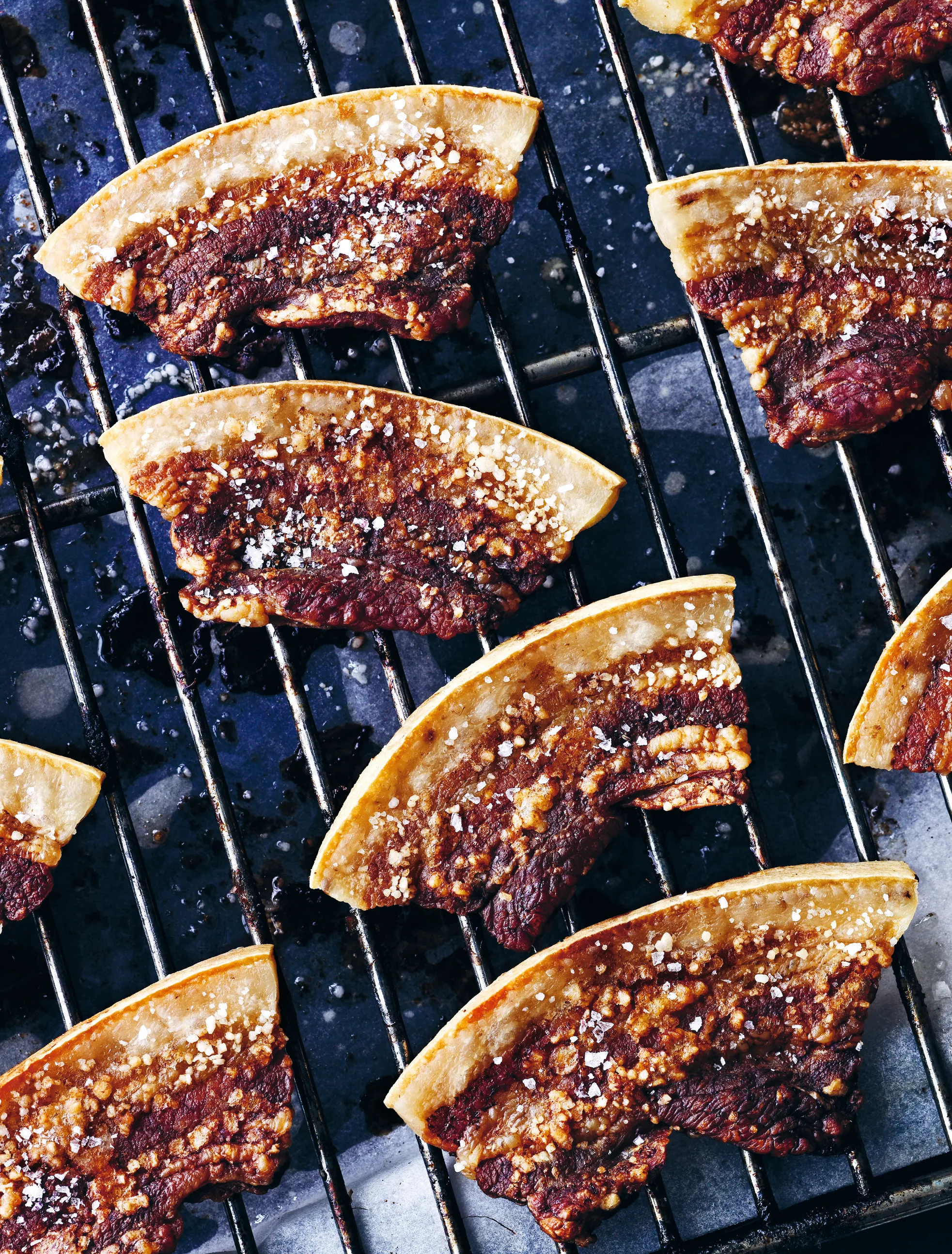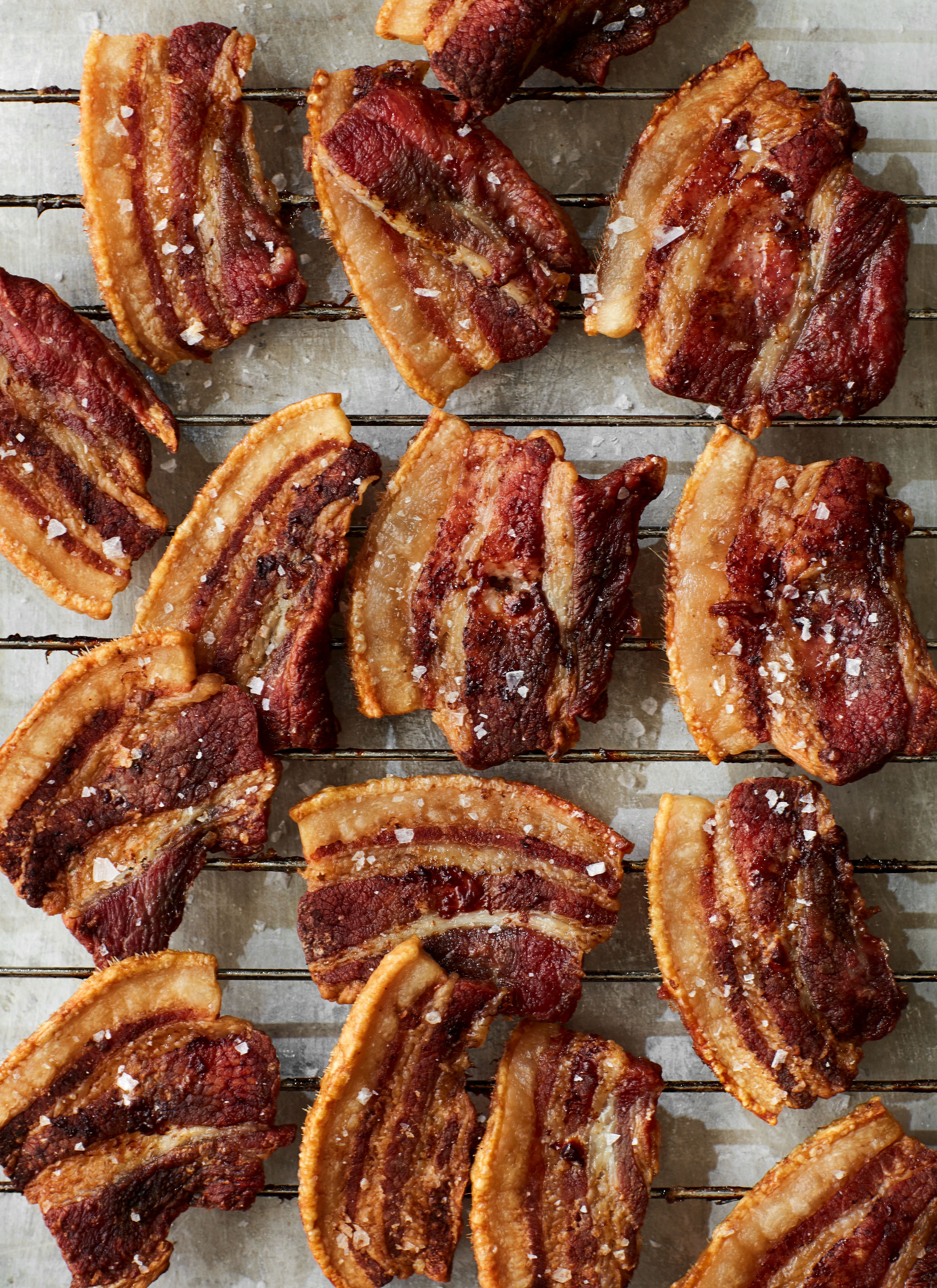 Krydr flæsket godt, og bank det lidt ud, hvis det er tykke skiver. Læg flæskeskiverne op på en ovnrist med en bageplade under, som fedtet kan dryppe ned i under stegningen. Sæt flæsket i ovnen, og steg det ved 180º i 40-45 minutter, indtil det er helt sprødt og gyldent.