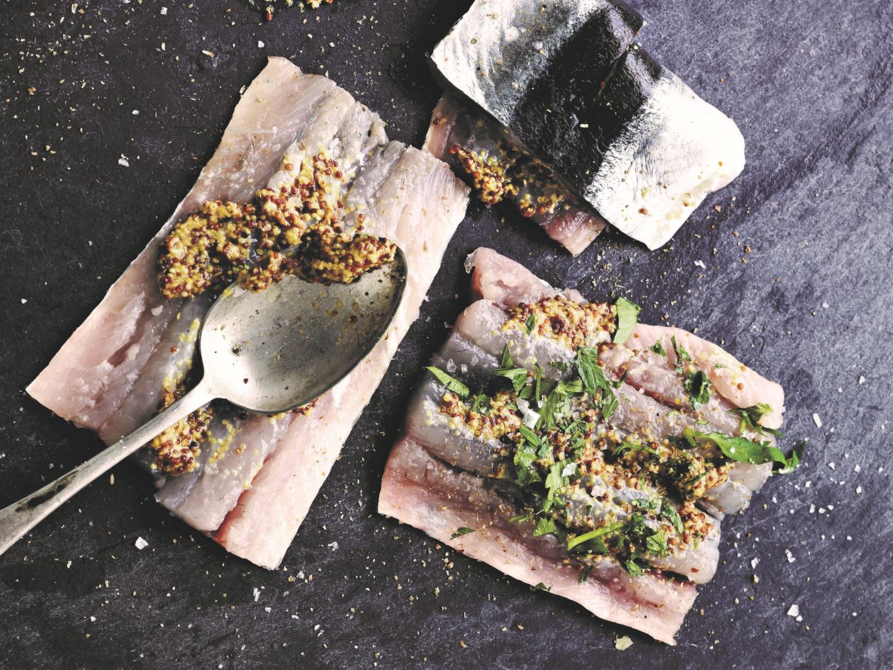 Tjek hornfiskefileterne for friskhed, skæl og grønne ben. Læg fileterne på skindsiden, og smør indersiden med sennep, drys med hakket persille, og krydr med salt og peber. Skær så hver filet ud i 4 stykker, og klap dem sammen med skindsiden udad. Vend stykkerne i hvedemel. Steg hornfiskestykkerne i halvt smør og halvt olie på en varm pande, 2-3 minutter på hver side, til de er flot gyldne og sprøde på skindet. Stykkerne kan godt finde på at åbne sig, når de kommer på pande, så det er en god ide lige at holde dem nede med en paletkniv i starten. Krydr evt. med lidt ekstra salt og peber på skindet.