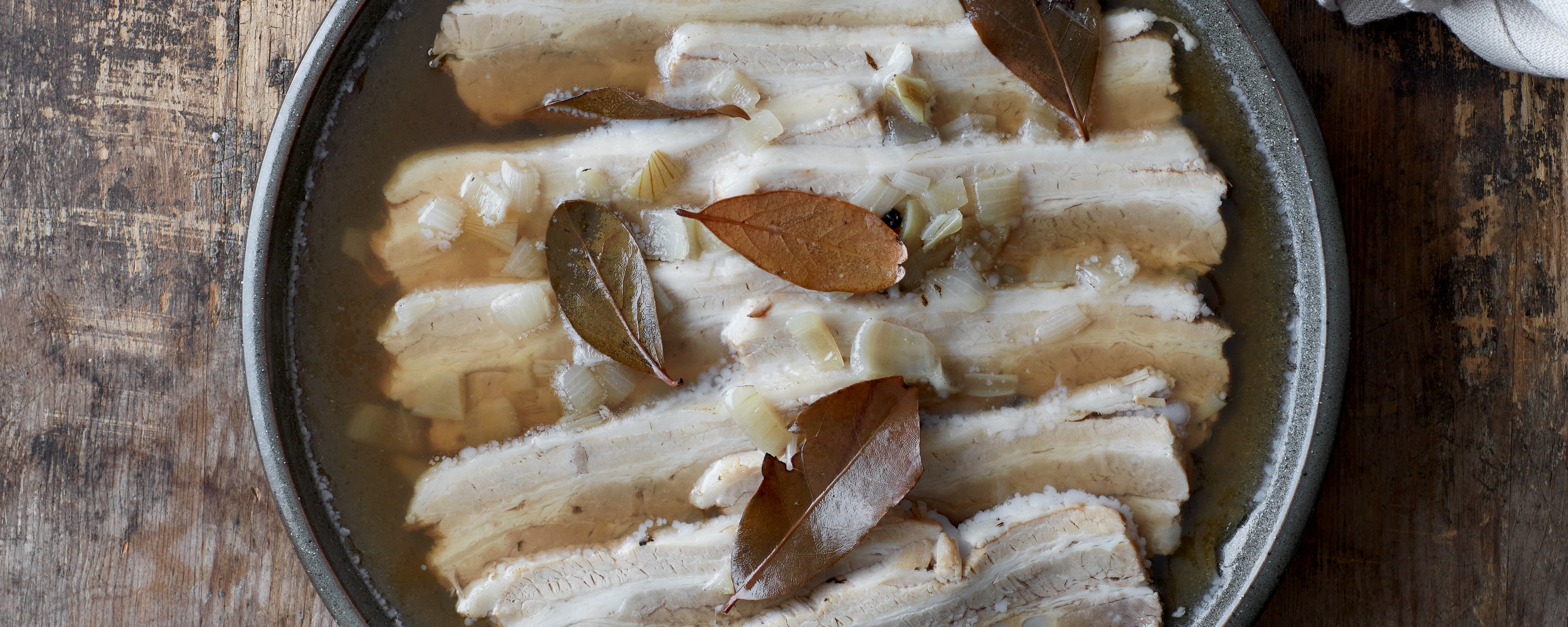 Kom kødet i en gryde sammen med al væsken, det snittede løg og krydderierne. Bring det hele i kog, og skum løbende af undervejs. Lad derefter retten simrekoge under låg i cirka 2–2½ time, til kødet er mørt, men stadig holder formen. Sørg for, at kødet hele tiden er dækket af væske, og tilsæt lidt vand om nødvendigt. Når kødet er færdigt, tages gryden af varmen, og kødet køler af. Stil det derefter på køl natten over. Næste dag fjernes det stivnede fedt fra overfladen, og kødet tages op af suppen. Kog suppen ind til ca. 1 liter, smag den til med salt og eddike, og sigt den. Tilsæt de udblødte blade husblas (gelatine), mens suppen stadig er varm. Fjern svært og eventuelt overskydende fedt fra kødet, og skær det i skiver. Læg skiverne på et fad med høj kant, og hæld den lune suppe over, så kødet dækkes. Sæt fadet på køl, og lad retten stå, indtil suppen har sat sig.