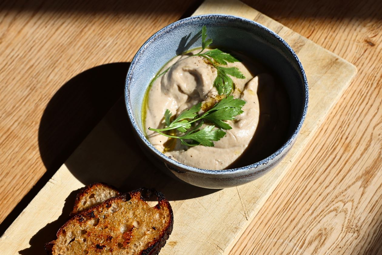 Kom svampe-løgblandingen i en blender sammen med de drænede bønner, citronsaft og den resterende olie. Blend til en glat og cremet konsistens – justér evt. tykkelsen med lidt af væsken fra bønnerne til ønsket konsistens opnås.