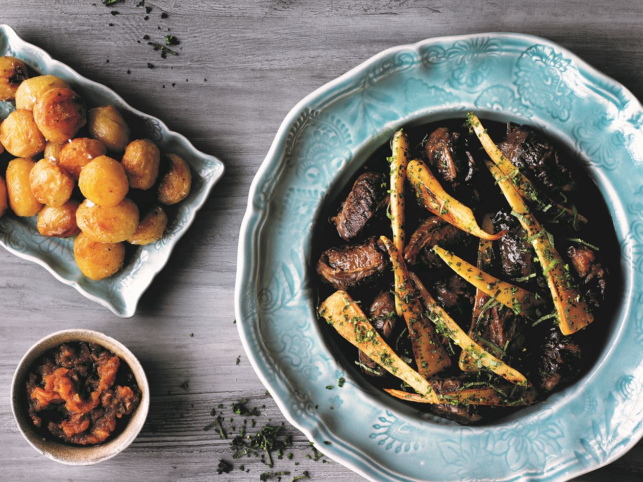 Kom kæberne ned i sovsen, vend dem rundt, så de nærmest glaserer, og lad dem få varmen. Server kæberne med persillerødderne og masser af det grønne drys. Spis med en god kvæde- eller æblerelish og stegte kartofler