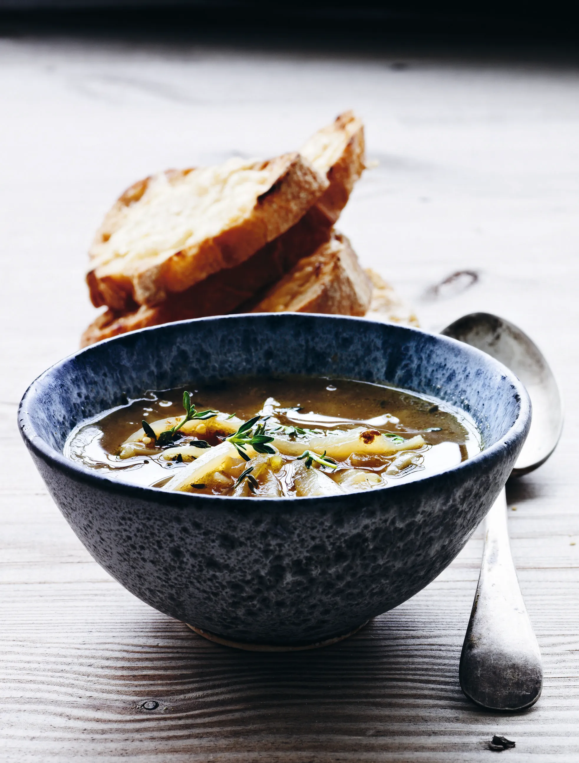 Fjern de hårde stilke fra kålen og snit bladene ret fint. Hvis du bruger rosenkål, så fjern de yderste blade og den grove del, der hvor rodfrugten sad på stokken, inden du skærer de små kålhoveder i mindre stykker. Skræl gulerødderne og pil løgene. Hak gulerødder, bladselleri og løg fint. Pil hvidløgsfeddene og hak dem fint, bortset fra 4 fed, som du skal bruge til at gnide brødet med. Mere om det nedenfor. Varm halvdelen af olien i en stor tykbundet gryde over jævn varme. Tilsæt løg og hvidløg og sauter dem under hyppig omrøring 5-10 minutter. Tilsæt gulerødder, bladselleri og timiankviste og sauter igen, til grøntsagerne falder lidt sammen. Krydr grundigt med salt og peber. Tilsæt eddiken og lad den koge næsten væk. Tilsæt hvidvinen og kog sagte i 30 minutter uden låg. Tilsæt de udblødte bønner, tomat og bouillon og kog videre ca. 1 1/2 time med låg på. Hvis du bruger dåsebønner, tilsæt dem sammen med kålen de sidste 10-15 minutter af kogetiden. Kog kålen med de sidste 10-15 minutter. Rør i suppen af og til. Smag den grundigt til med salt og peber. Grill brødskiverne på begge sider på en pande eller under ovnens grillelement (du kan bruge brødristeren, men den lidt røgede smag fra grillsporene er en stor kvalitet ved så simpel en ting). Halver hvidløgsfeddene og gnid brødskiverne godt med hvidløg på den ene side. Stænk lidt olivenolie udover. Drys havsalt og gerne lidt timianblade på og kværn lidt peber udover. Server bruschettaerne til suppen, så kan dine gæster selv bestemme, om de vil sænke brødet ned i suppen. Det sidste er i høj grad en smagssag.