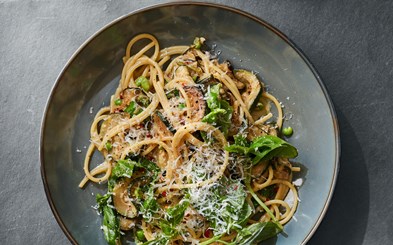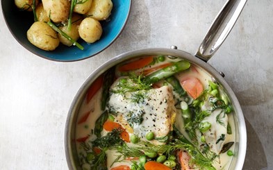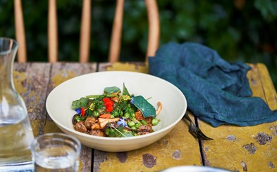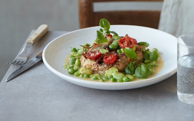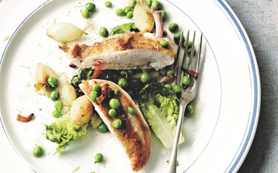 Stegt kylling med braiserede ærter, perleløg og bacon